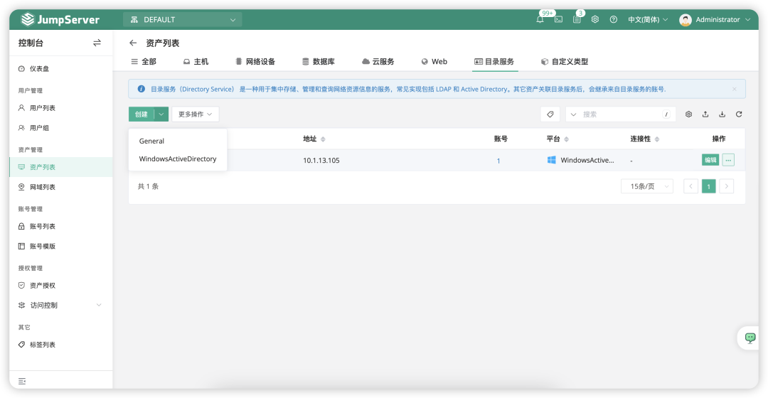 JumpServer v4.10 LTS版本支持AD、LDAP目录服务集成。该功能允许JumpServer与企业现有目录服务(例如Active Directory、LDAP)进行深度对接,从而实现账号的集中管理。通过同步用户身份信息和权限策略,管理员可直接通过JumpServer控制台授权设备访问,无需在多个系统间切换,大幅提升了运维效率。