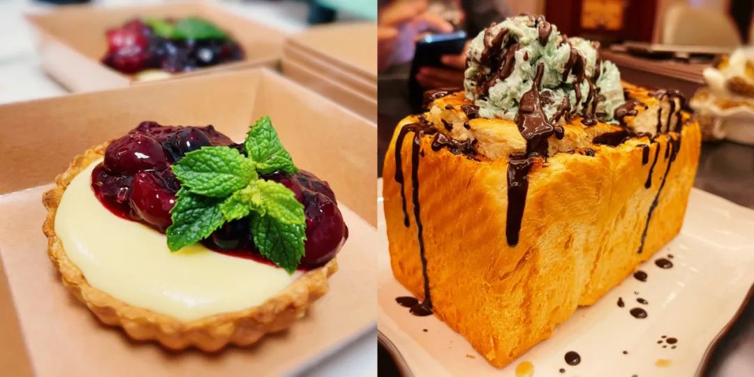 图|左:混合浆果芝士挞 右:薄荷巧克力冰淇凌配蜂蜜吐司