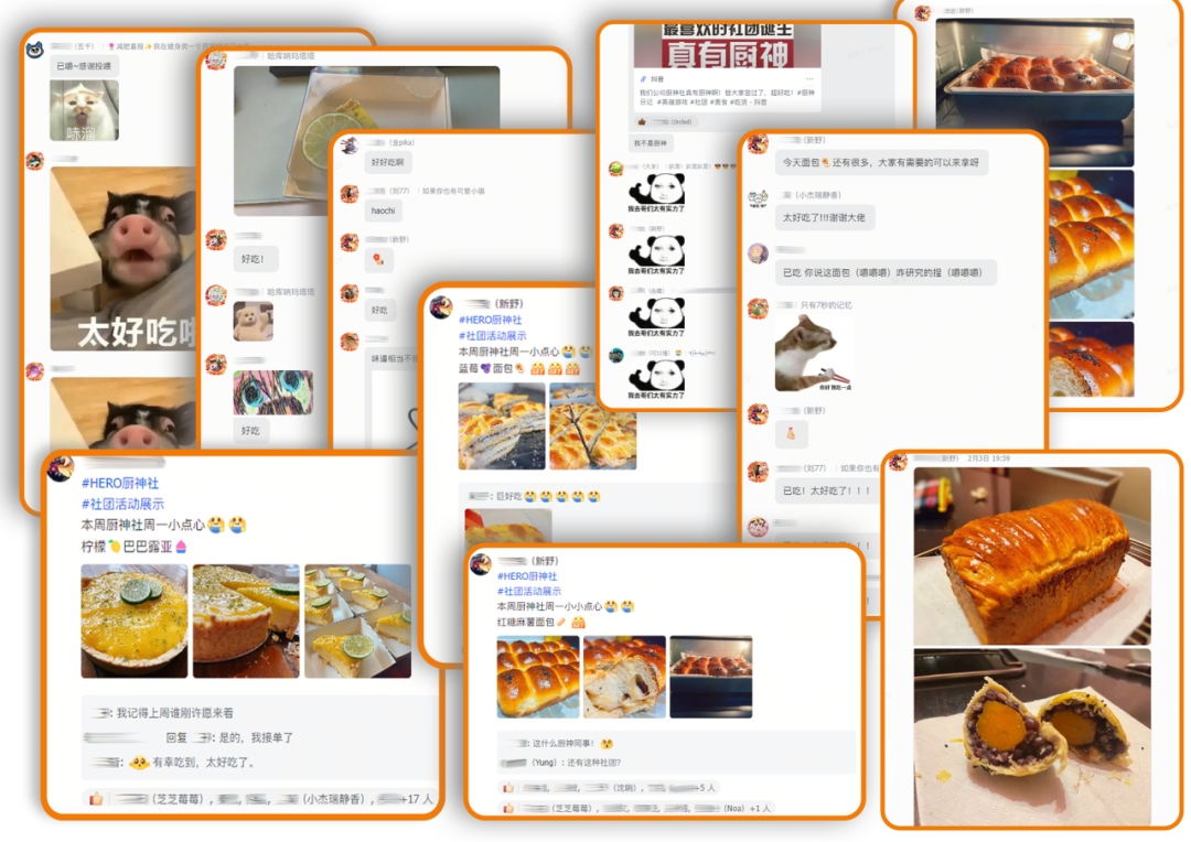 “HERO 厨神社”建群初衷是交流烹饪技巧,却意外变成了 “投喂群”。每周一我会带着自己烤的甜点来公司,除了巴巴露亚、夹心面包、面包棒之类的西点,也会做中式的黄金糕、马拉糕。甜点不容易踩雷,大家接受度高,而且它是难得隔夜以后还能够尝到70%的风味。一块小小的甜点,就能让同事们每周更开心一点。时间久了,每周一社团里有了常驻的期待,在分享美食的过程中,大家聊聊味道、分享心情,拉近了彼此的距离。收到了很多同事的反馈让我特别有成就感,我觉得,烘焙不仅是做食物,更是传递温暖和情感的方式。
