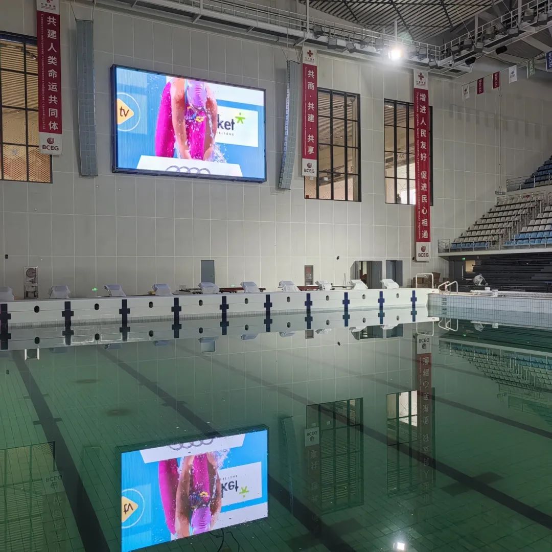 在毗邻体育场的白俄罗斯国际标准游泳馆内,艾比森大屏覆盖比赛池、跳水池、热身池等游泳馆信息显示全场景,高清画质可精准呈现运动员比赛成绩、计时数据及水下机位画面,满足当前及未来赛事信息化与场馆智能化的需求,产品采用多重防水设计,适应高湿度环境,更完美适配游泳场馆的特殊环境需求。