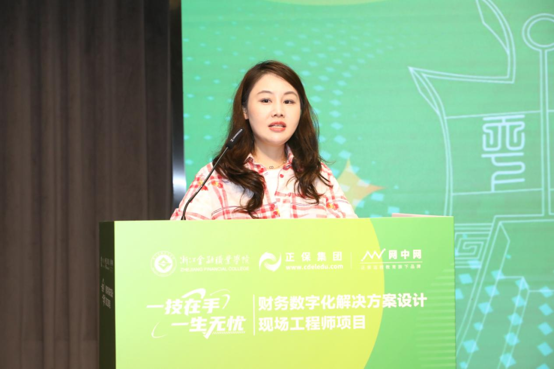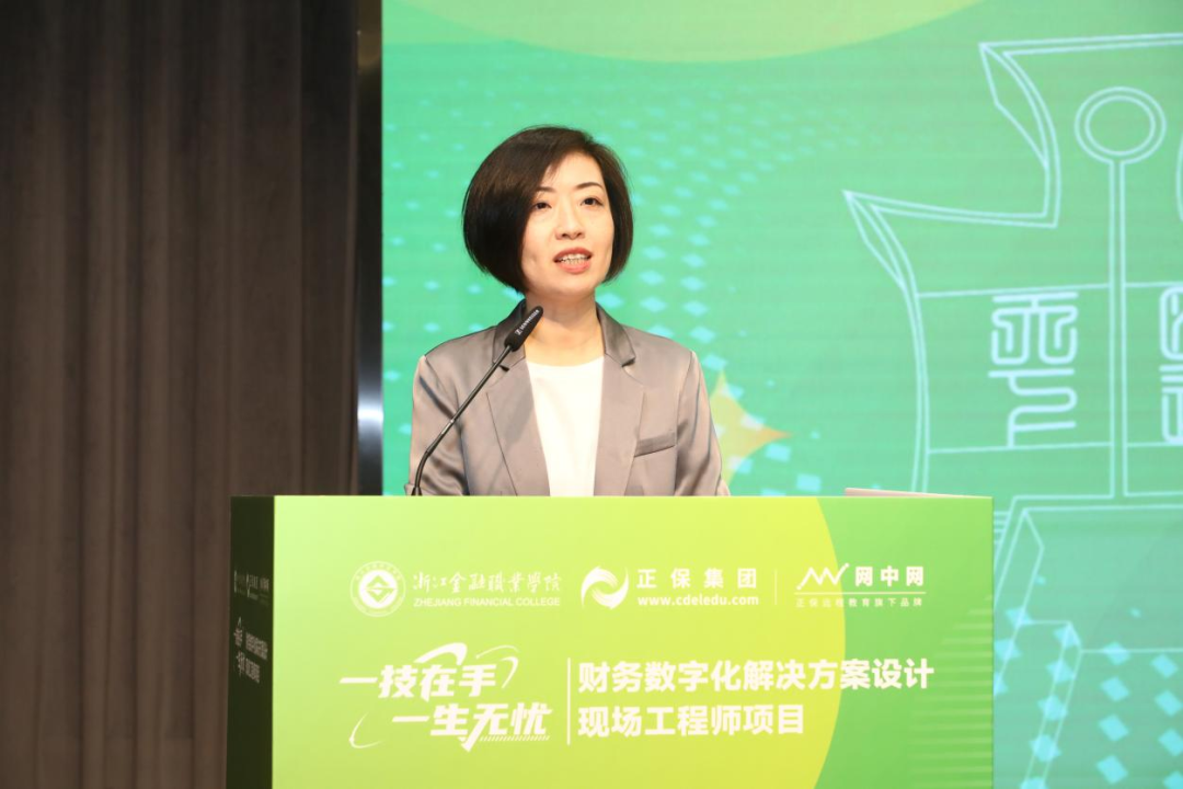 浙江金融职业学院副校长陈颖淑首先发表致辞。陈颖淑代表学校向莅临现场的嘉宾表示诚挚欢迎,对北京东大正保科技有限公司的鼎力支持致以衷心感谢。陈颖淑强调,现场工程师项目的实施不仅是对职业教育人才培养模式的创新,更是对产教融合深度推进的具体实践。通过此次合作,能够实现学生职业成长、教师能力提升、企业数字化转型,开创三方共赢新格局。她祝愿此次项目能够取得丰硕成果,为社会和行业培养更多高素质财务数字化现场工程师。