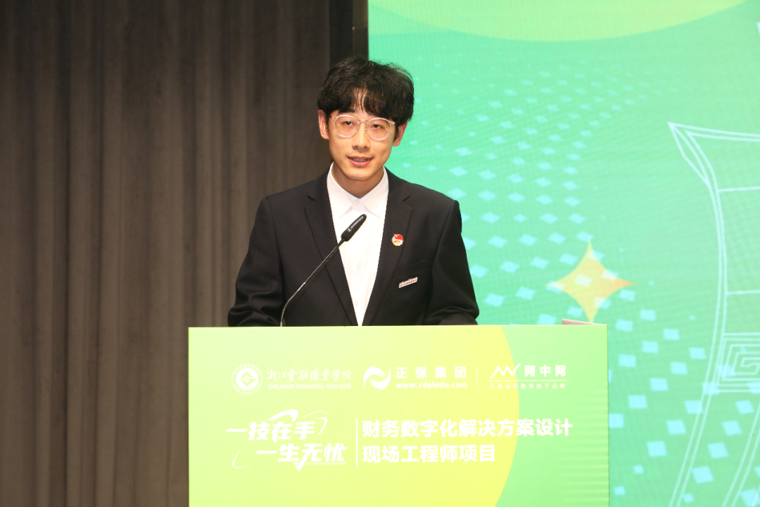 北京东大正保科技有限公司副总裁刘青在致辞中对项目的启动表示热烈祝贺。她提到,当前财经领域正经历从“核算型”向“战略型”“数字化”的转型,企业对既懂财务业务又具备数字化技能的现场工程师需求迫切。作为深耕教育科技领域多年的企业,正保教育集团将依托自身在财务数字化领域的技术积累和行业资源,为项目提供真实的产业案例、前沿的技术培训和实践岗位,构建“教学—实训—实战—就业”全链条服务体系,打造产教融合育人新范式,实现教育链、人才链与产业链的有机衔接。