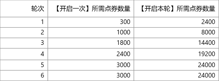 4、同一轮开启所消耗的点券数量不变,不同轮启动消耗的点券会逐轮递增