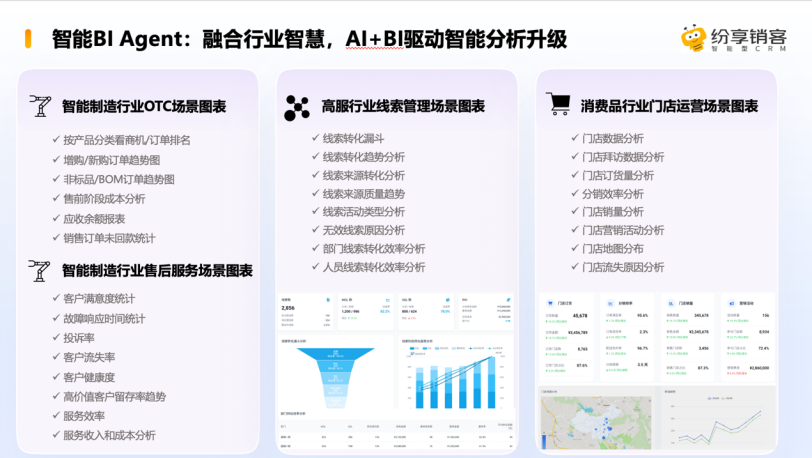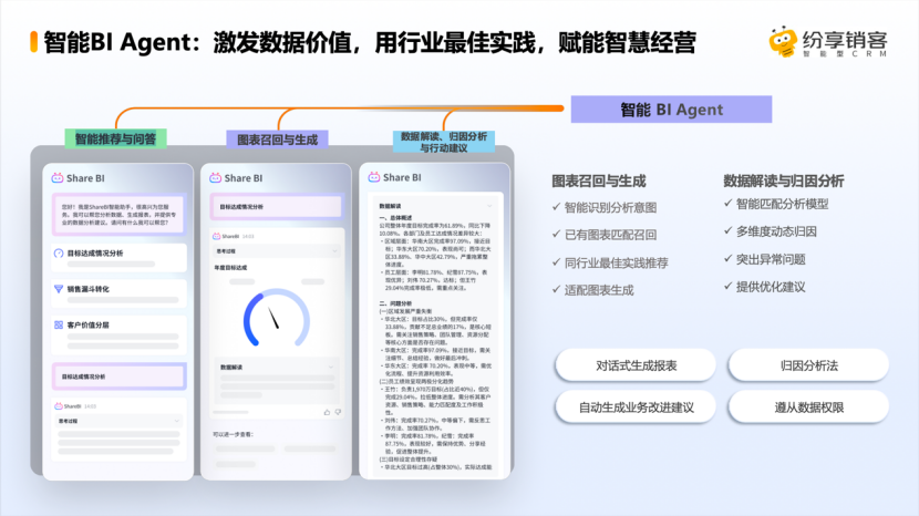 如何挖掘数据价值并赋能到整个作业过程中?智能 BI Agent 具备图表召回与生成、数据解读与归因分析等功能,这不是一个简单的工具,而是基于纷享销客的行业智慧及营销服领域的最佳实践,帮助 AI 更好地进行场景洞察、图表生成以及业务分析,进而对系统中一些关键性的报表数据进行深入解读和风险预警。