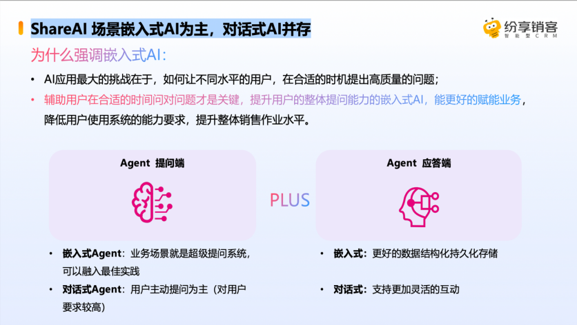随着 AI 产品的出现和普及,大多数人已经慢慢习惯对话式 AI ,与此同时,有一个问题需要关注:如何进行高质量的提问?尤其在涉及企业服务场景时,对同一个问题进行不同水平的描述,AI 给出的回答会有很大不同。因此,纷享销客在进行ShareAI 的产品设计过程中,更多强调嵌入式与对话式相辅相成的理念,将每一个 AI 场景嵌入到销售日常作业过程,进而提高提问水平。