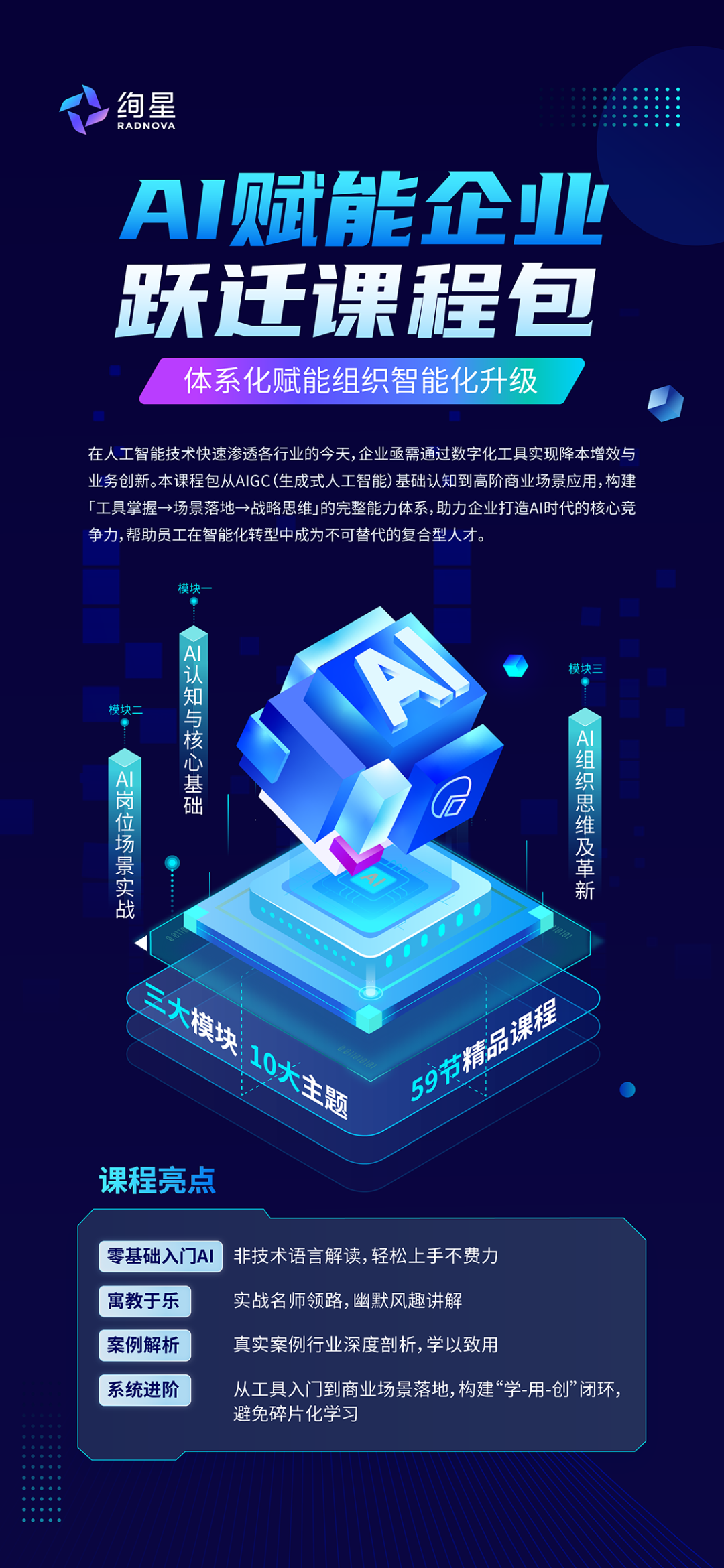 然而,面对复杂的AI技术体系,许多企业感到无从下手,员工也难以快速掌握并应用到实际工作中。为此,“AI赋能企业跃迁课程包”应运而生,为企业提供从AIGC基础认知到高阶商业场景应用的完整解决方案。