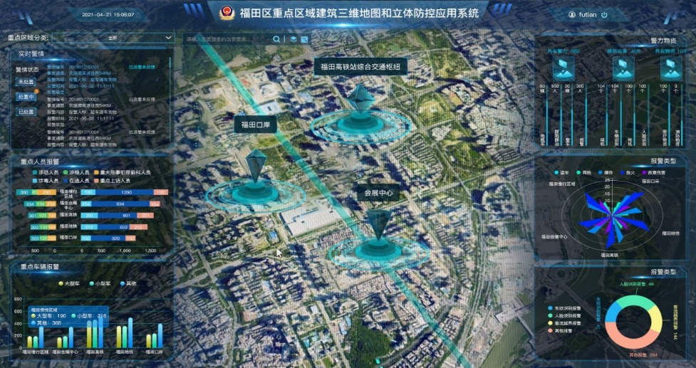 立得空间率先将“3DGIS+BIM+IoT”的创新理念融入到公安行业,通过实景三维建模虚拟还原福田区重点区域建筑,搭建一套数字孪生立体防控服务平台,提供综合看板、指挥调度、活动安保、治安态势等智慧化应用,把精细化防控落到了实处。
