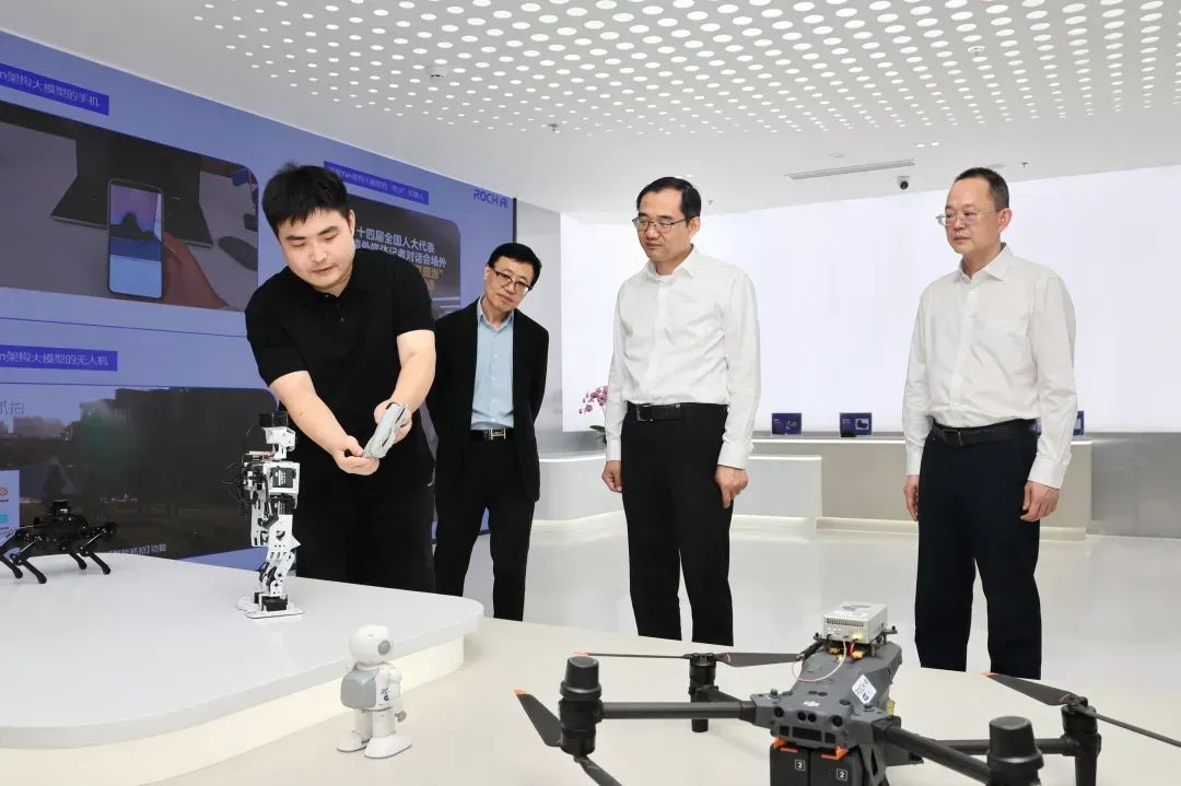 随后,李政书记观摩了RockAI自主研发的Yan架构大模型在手机、PC、机器人、无人机、机器狗等终端设备上流畅运行的端侧应用能力,依托「MCSD」和「类脑激活机制」两大基础原理创新,Yan架构大模型可大幅提升模型性能与效率,可高效处理语音、图像、文本等多种模态信息。李政书记对RockAI即将在2025年世界人工智能大会上发布的大模型表示期待。