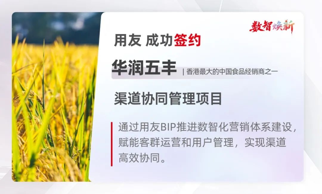 招商局集团、悦达集团、华润五丰、启胜物业、洛阳钼业、浙江金投、金浔股份、汇源集团等众多大型企业与用友签约。从农业产业化到综合投资领域,从百年央企到区域龙头企业,通过用友BIP进行智慧司库、人力资源数智化、营销数智化、数智化采购等数智化升级。同时,面对全球化发展需求,通过用友BIP构建全球一体化平台,为企业量身打造数智化核心引擎,助力企业顺利出海。