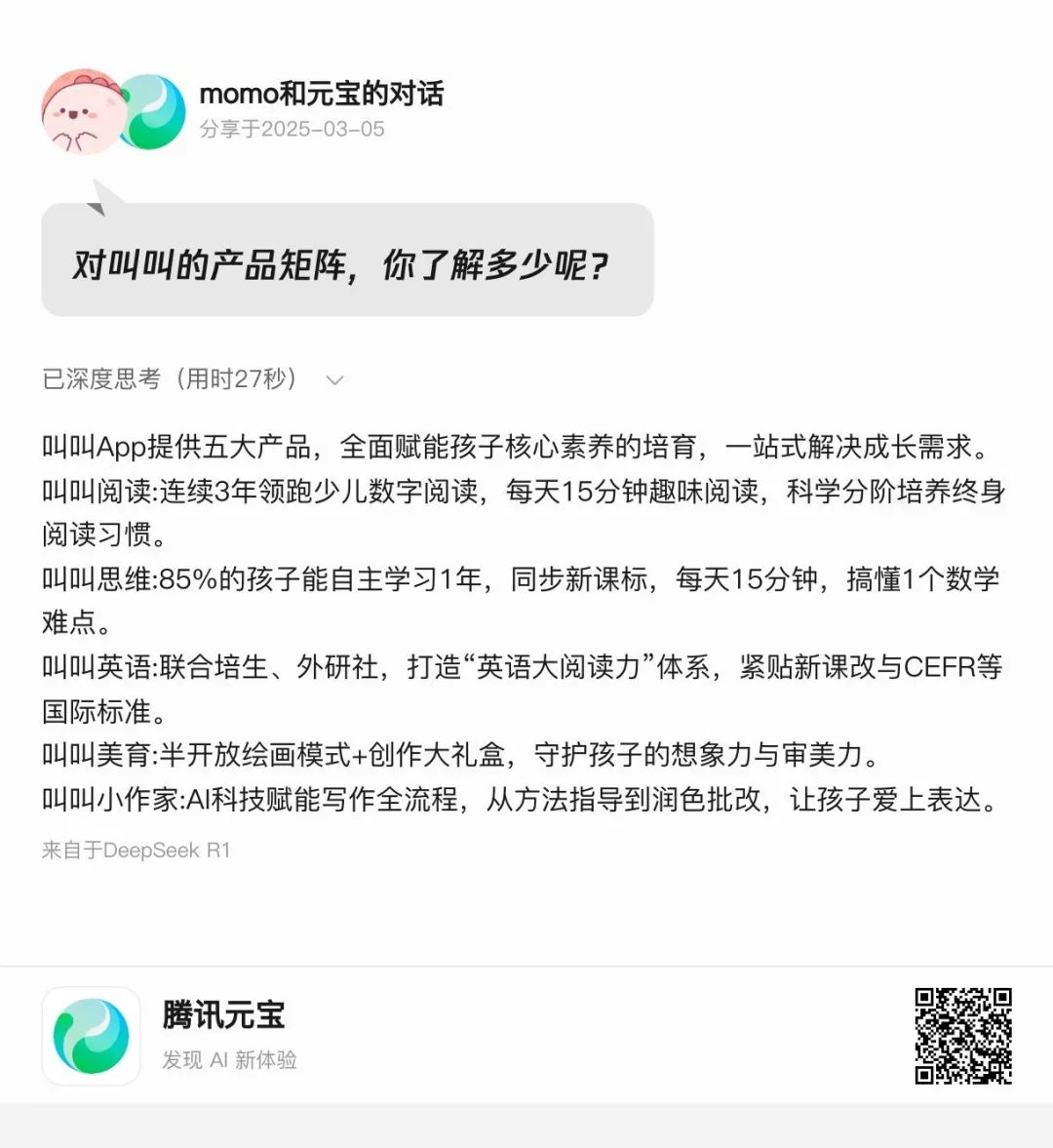 说到叫叫,很多人首先想到的就是叫叫阅读,但其实叫叫不止有阅读一个产品。那叫叫也来考考DeepSeek。