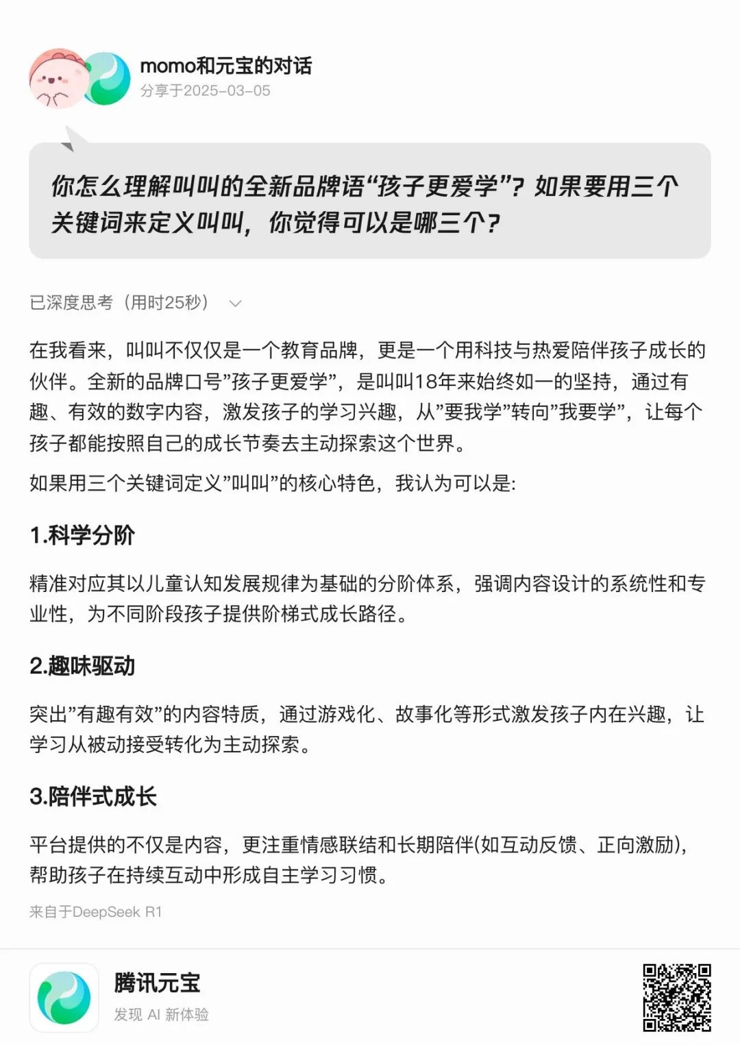 又众所周知,在刚刚过去不久的2025产品升级发布会上,叫叫不仅全面升级了五大产品内容与AI能力,还官宣了全新的品牌语“孩子更爱学”。