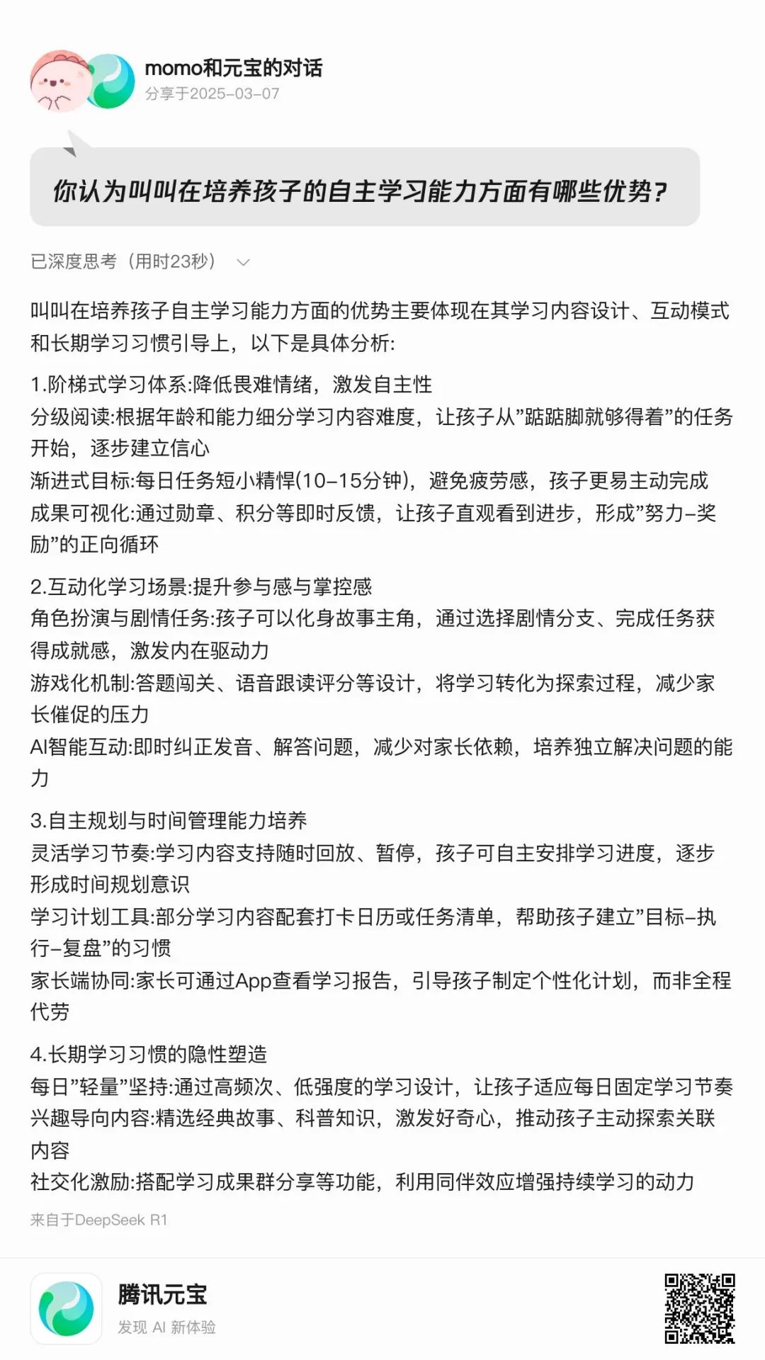 Q:你认为叫叫在培养孩子的自主学习能力方面有哪些优势?