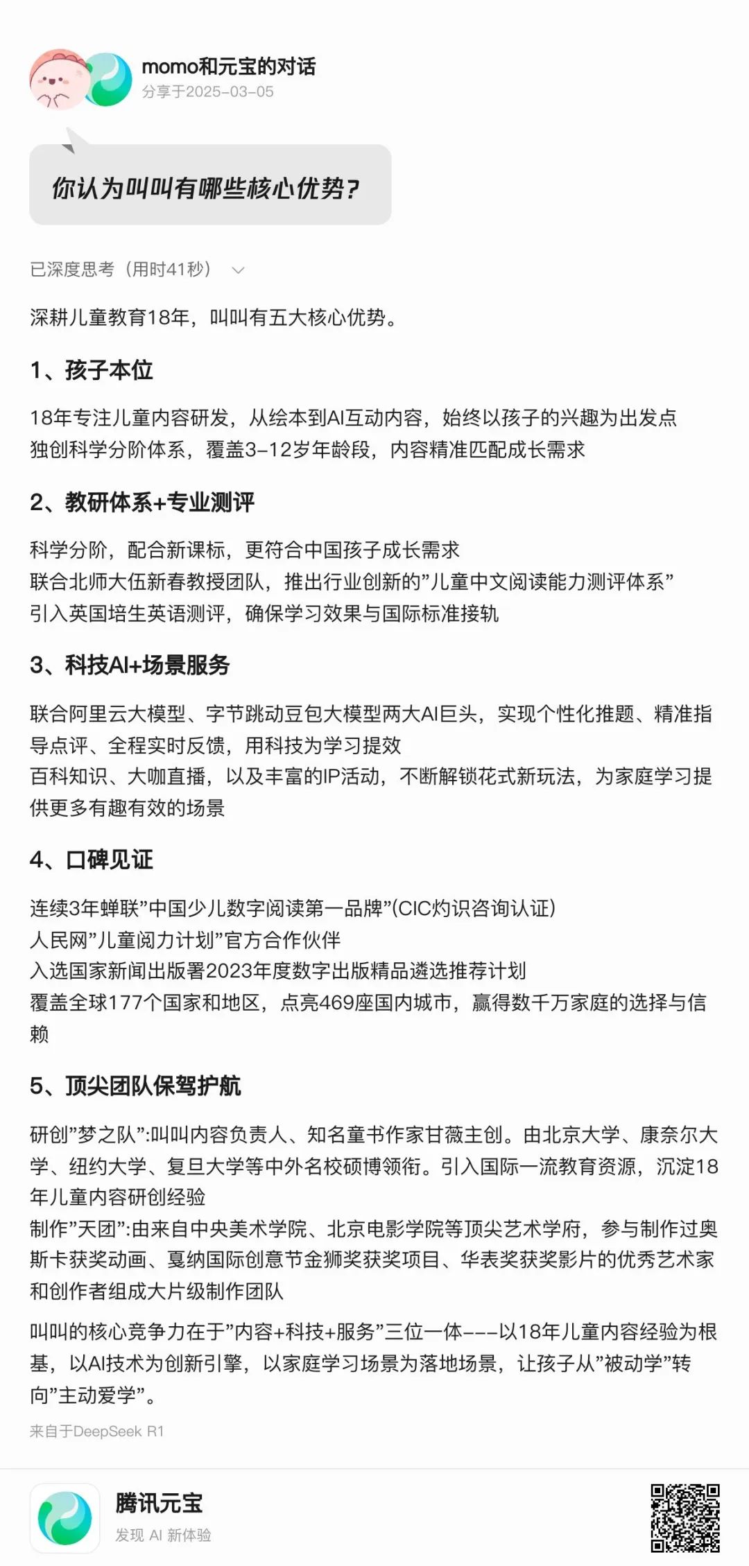 “叫叫的核心竞争力在于‘内容+科技+服务’三位一体——以18年儿童内容经验为根基,以AI技术为创新引擎,以家庭学习场景为落地场景,让孩子从‘被动学’转向‘主动爱学’。”