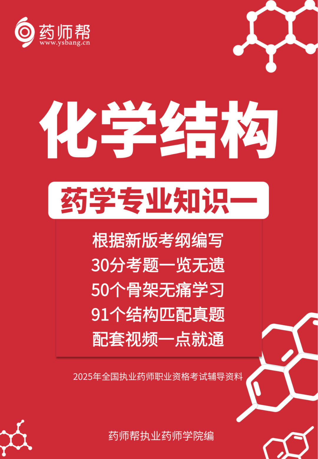 西药一的药物化学历来是考试的重点内容,分值占比达23-30分,其中化学结构图高达10-16分。药师帮教研团队重磅推出《西药一化学结构图谱》:全书107页精华内容,30分考题一览无遗、50个骨架无痛学习、91个结构匹配真题。根据最新考纲全新整理,考生可以特别关注新增部分,是拿下西药一化学板块的关键资料!建议药师帮学员,结合视频课程学习,一点就通,更快突破提分!