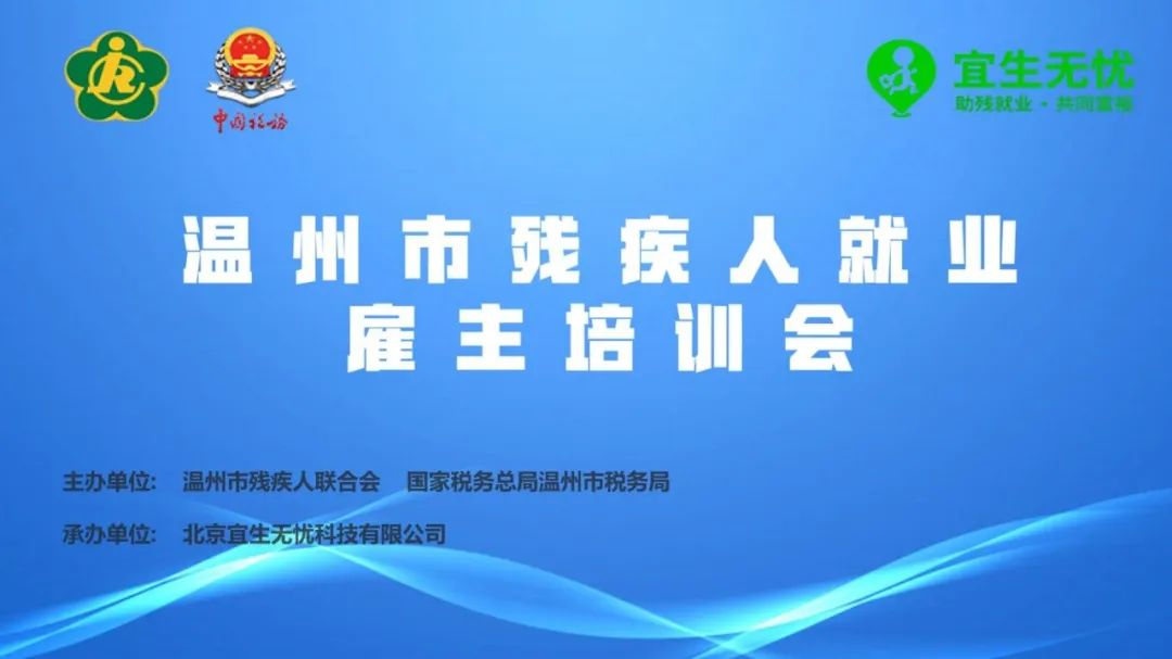 2025年4月17日,由温州市残疾人联合会、国家税务总局温州市税务局联合主办,北京宜生无忧科技有限公司协办的“温州市助残就业雇主培训会”顺利召开。本次会议旨在提升企业对残疾人就业政策的认知度,助力企业履行社会责任,推动残疾人实现更充分、更高质量的就业。