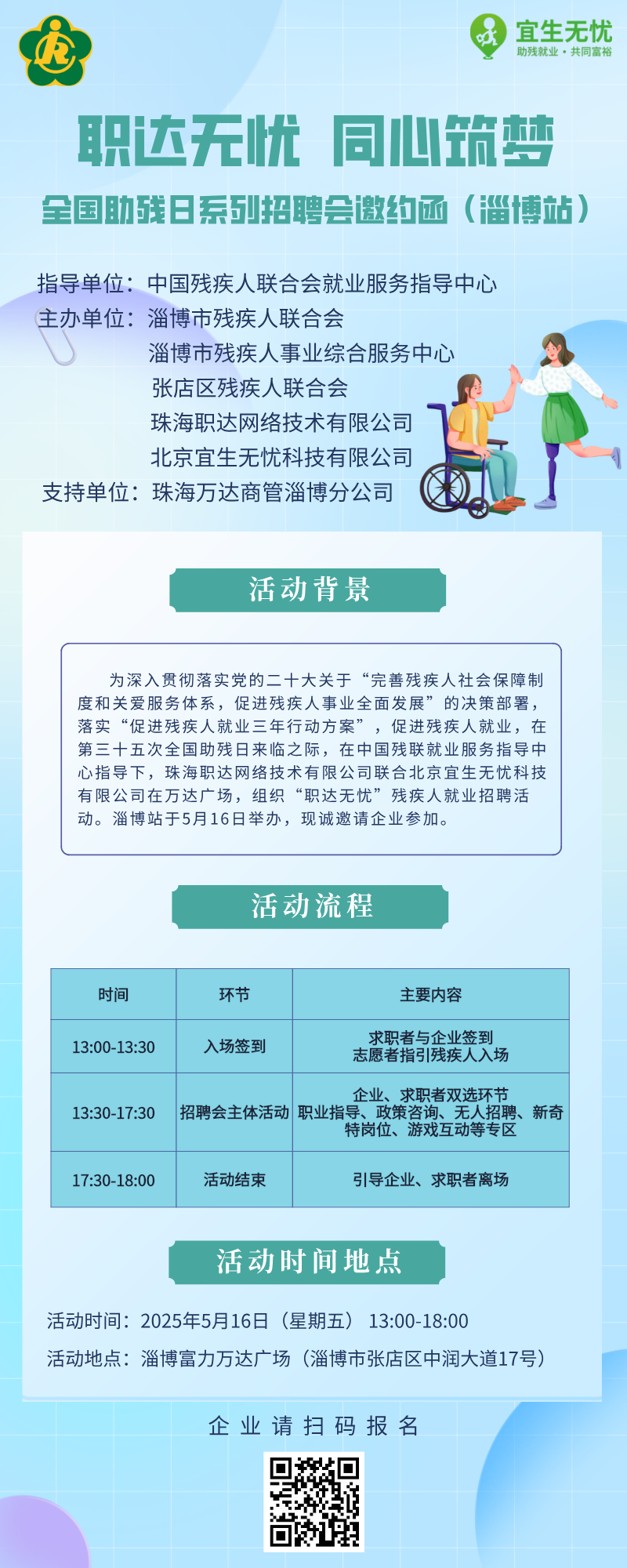 在中国残疾人联合会就业服务指导中心的指导下,珠海职达网络技术有限公司与北京宜生无忧科技有限公司携手在万达广场,组织“职达无忧”残疾人就业招聘活动。淄博站于5月16日举办,现诚邀请企业参加。