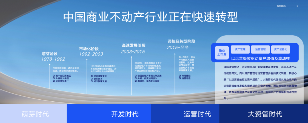 中国商业不动产行业历经多次变革浪潮,从改革开放初期的"萌芽探索",到土地市场化催生的"开发黄金期";从城镇化加速驱动的"高速扩张期",再到如今以运营赋能为内核的"调控转型期",商业不动产服务也随之发生着变化。