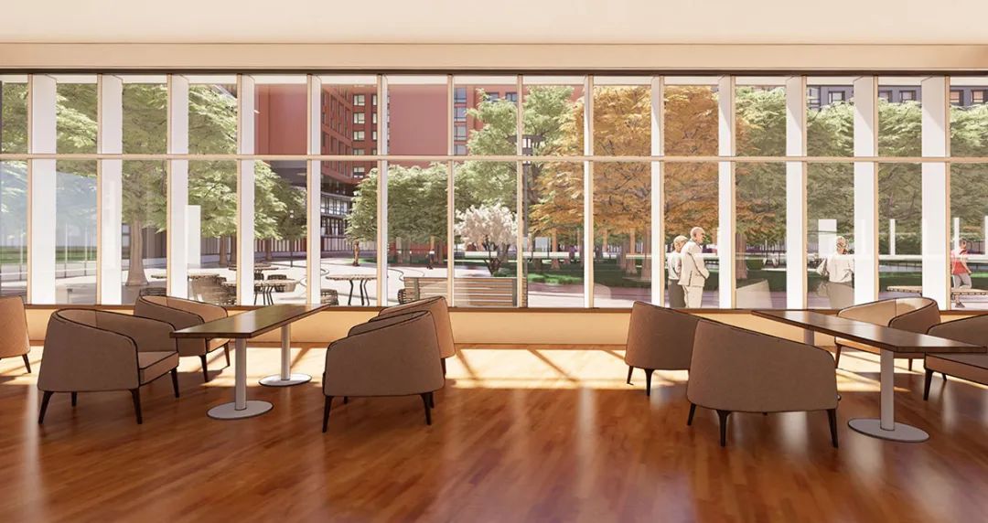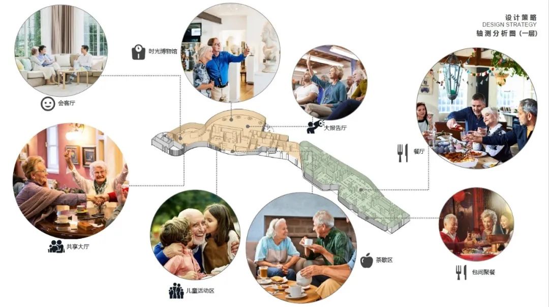 项目首层规划了一条“活力街”,它不仅是社区对外的名片,更是长者与社会对话的窗口。街道两侧布局特色餐饮、茶馆、多功能厅等业态,将日常生活与城市资源无缝衔接。通过打造社会生活空间,鼓励长者在此分享智慧、发起活动,让退休生活延续社会价值。这种开放式的街区规划,既降低了运营成本,又通过商业收益反哺社区,形成可持续的运营生态闭环。最重要的是,为老人们的生活创造了一种能够延续社会生活和角色的张力。