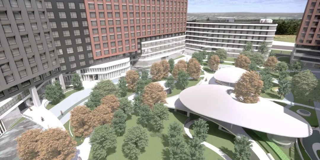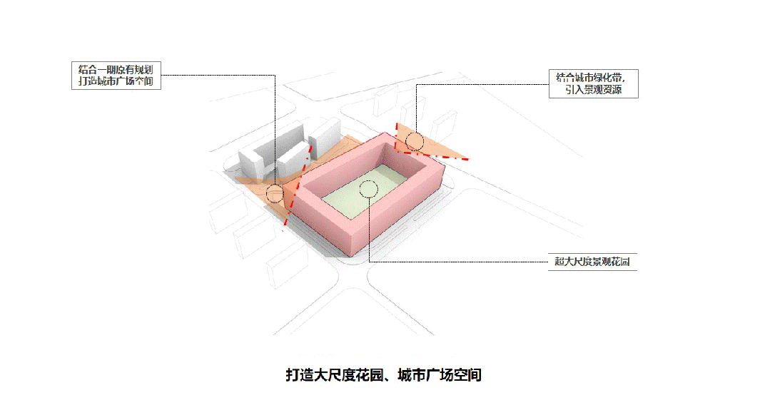 规划设计结合一期原有的规划布局打造城市广场以及内部的超大尺度景观花园。进而划分建筑体量,满足合理的建筑功能并形成内外空间的连续性。最后形成从外到内完整的生活空间属性,营造惬意的全景生活氛围。