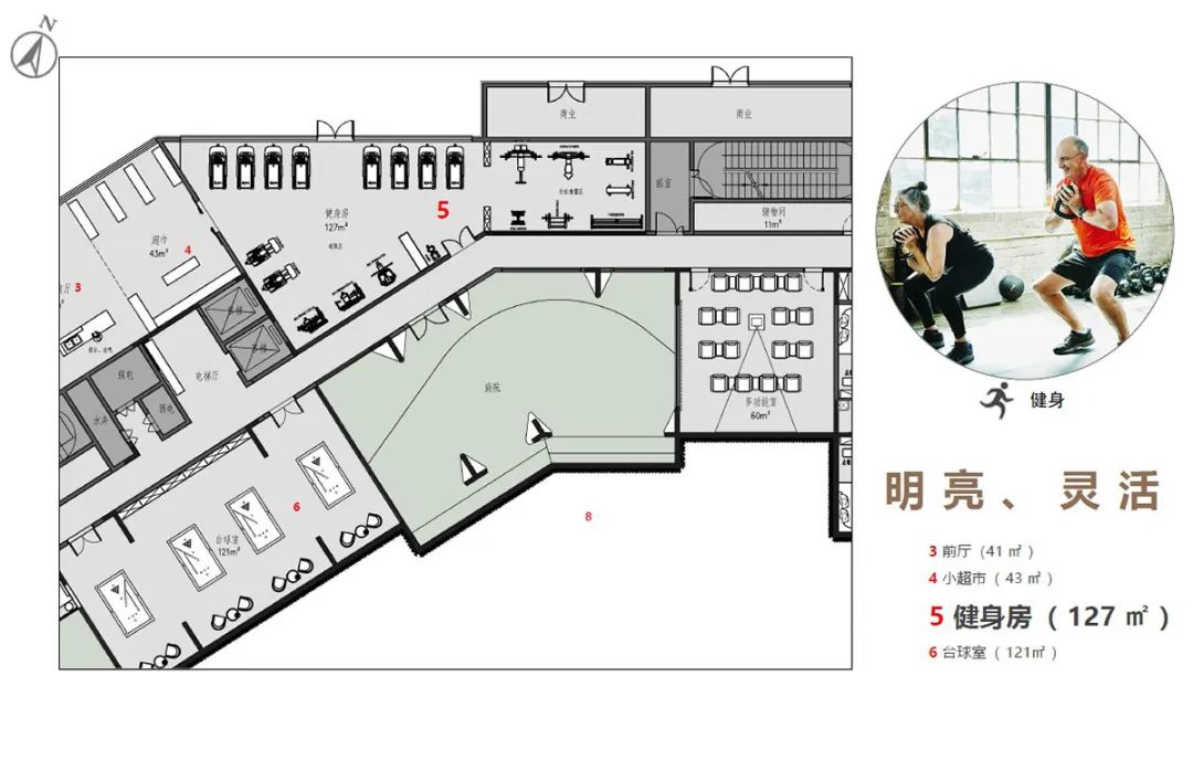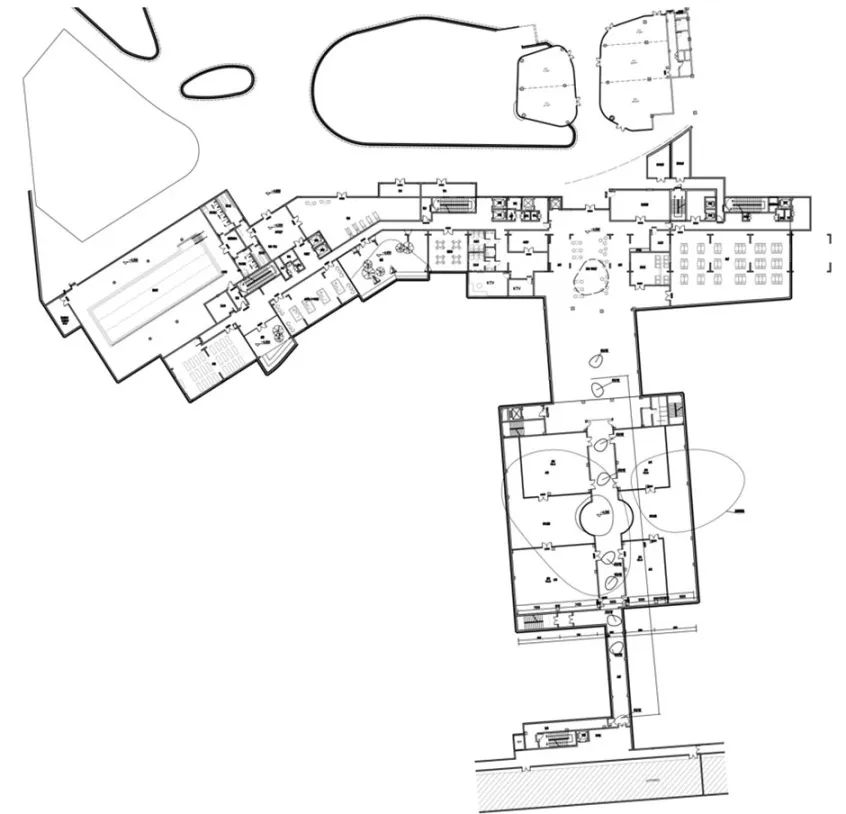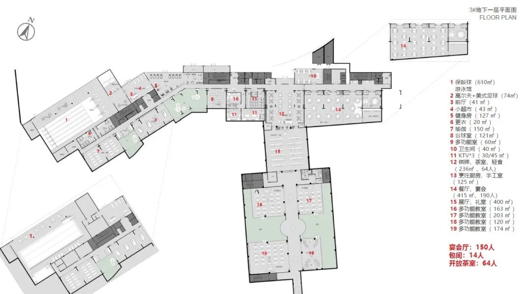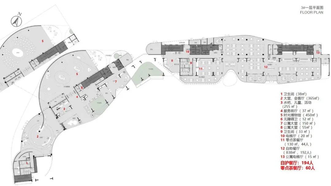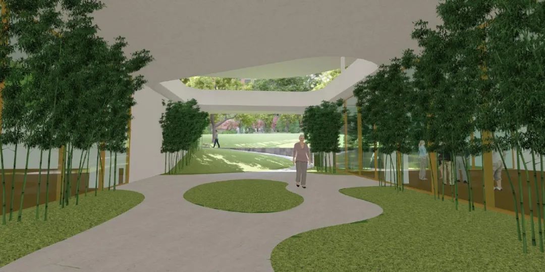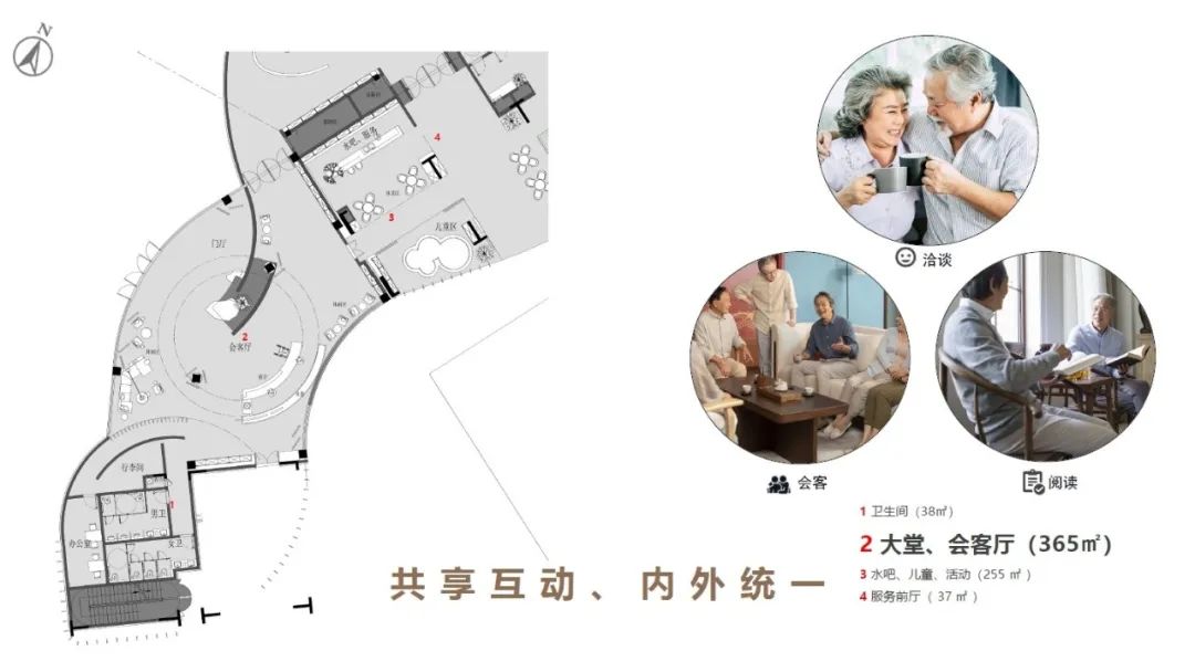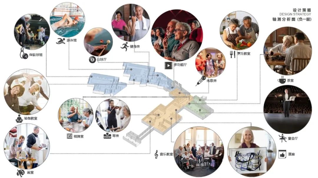 一二期庭院通过流动形态相互贯通,超大尺度的中央花园、下沉庭院与屋顶露台形成立体景观体系。引入“建筑景观一体化”思维,模糊室内外界限,让阳光、绿意与清风自然渗透。养老社区的本质是“人的联结”。项目以“朋友圈—社群生活”为纽带,规划书法教室、声乐厅、瑜伽教室等多元空间,鼓励长者从“被服务者”转变为“生活共创者”。社群运营借鉴“共享自治”理念,通过多功能展厅、公共教室等模块,让长者在兴趣社群中重拾归属感。