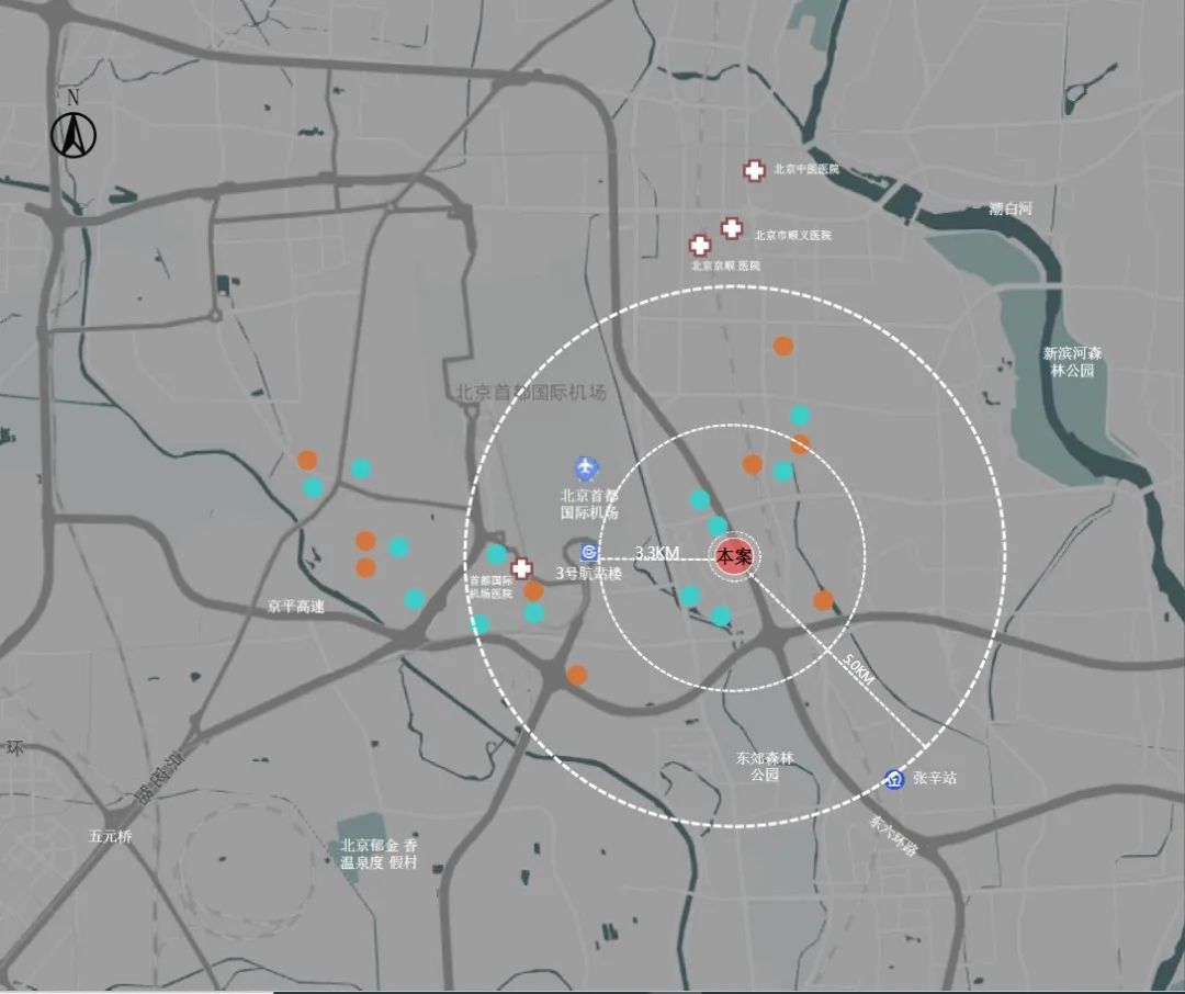 项目择址顺义区,毗邻首都国际机场,距市中心仅20公里,既避开了城市的喧嚣,又享有便捷的交通网络。周边15公里内聚集多家三甲医院,其中北医三院首都机场院区仅6.2公里,医疗资源触手可及。虽然区域内其余生活配套不足,但反成项目契机——当代时光里二期以“自我完善”为使命,通过活力街、社群空间与生态公园的构建,将社区打造成一座自给自足的“微型城市”。