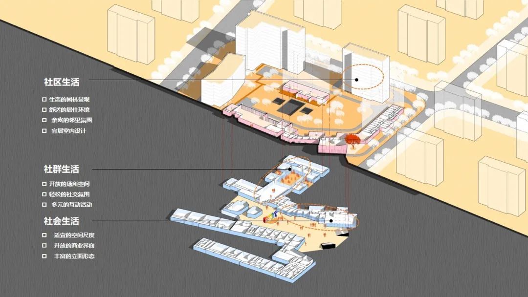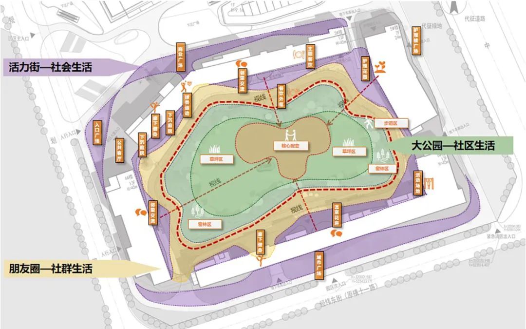 通过内向型的超大尺度庭院,以及由外向配套设施和内部专用配套设施构成的立体活力街巷,营造了兼具社会公共生活、社区私密生活和社群圈层生活的融合场景。