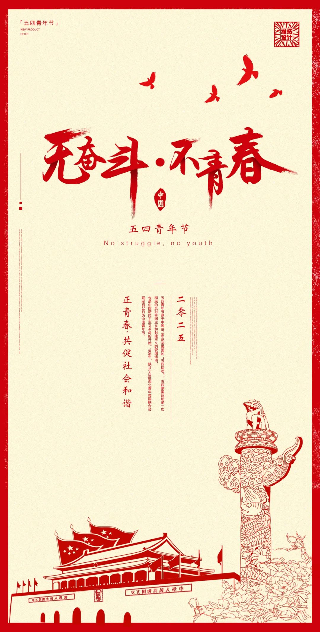 青春无关年龄,而在于心境。拒绝“躺平”,拒绝“内耗”,在每一个“可为”的时代,做“有为”的自己。五四精神永不褪色,愿你我始终步履铿锵,与时代同行,让青春在中华民族伟大复兴的征程中绽放光芒!