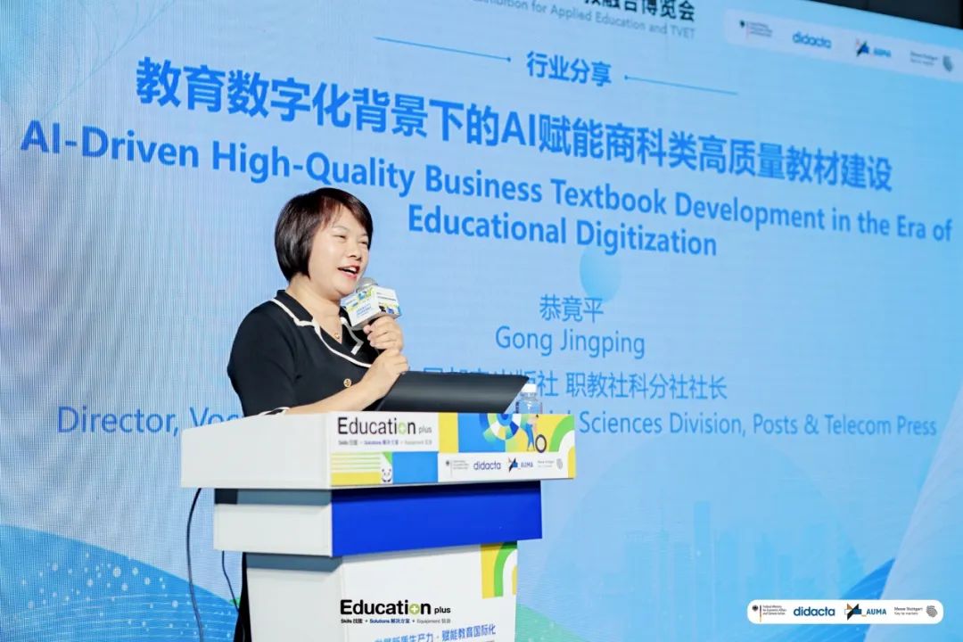 人民邮电出版社职教社科分社社长恭竟平分享了人邮社在数字化背景下所进行的商科高质量教材建设实践,重点介绍了人工智能与商科专业课程相融合的教材解决方案,尤其是人邮社联合博导股份及国内多家知名院校和企业,共同开发的《AI融合创新系列教材》,将AI技术知识与院校专业建设课程内容相融合,集中体现了人邮社立足技术发展,积极进行教育出版模式创新的担当。