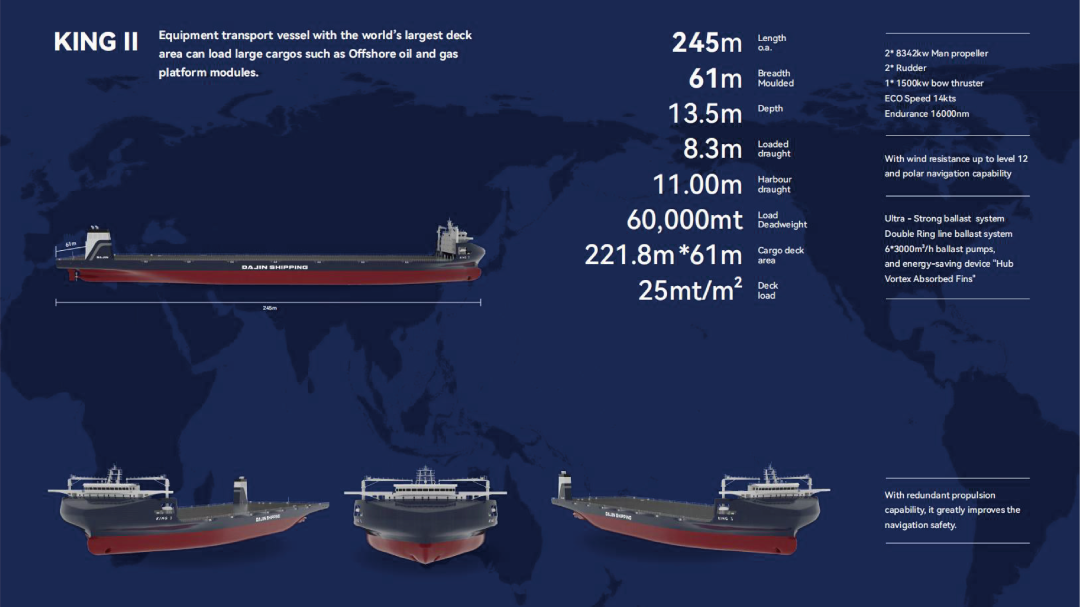 针对海上风电装备运输难题,大金重工于2023年收购造船厂并正式进军造船领域,在细分船型方面,大金重工以建造各类甲板运输船、半潜船、重吊船、浮船坞、风电运维和风电工程船等为主,目前正在建造的风电海工装备运输定制船型 ——KINGII甲板运输船以领先参数刷新行业标杆:船舶总长 245 米,型宽 61 米,有效载货面积达13529.8平方米,是全球甲板面积最大的运输船,单船运量较目前行业内最大船型提升30%以上;目前,大金重工规划打造拥有20余条不同类型特种船舶的大型综合特运船队,最终打造“工厂直送项目现场”的“门到门”交付体系,大金重工用实际行动重新定义全球重大件海运的效率与服务标准。