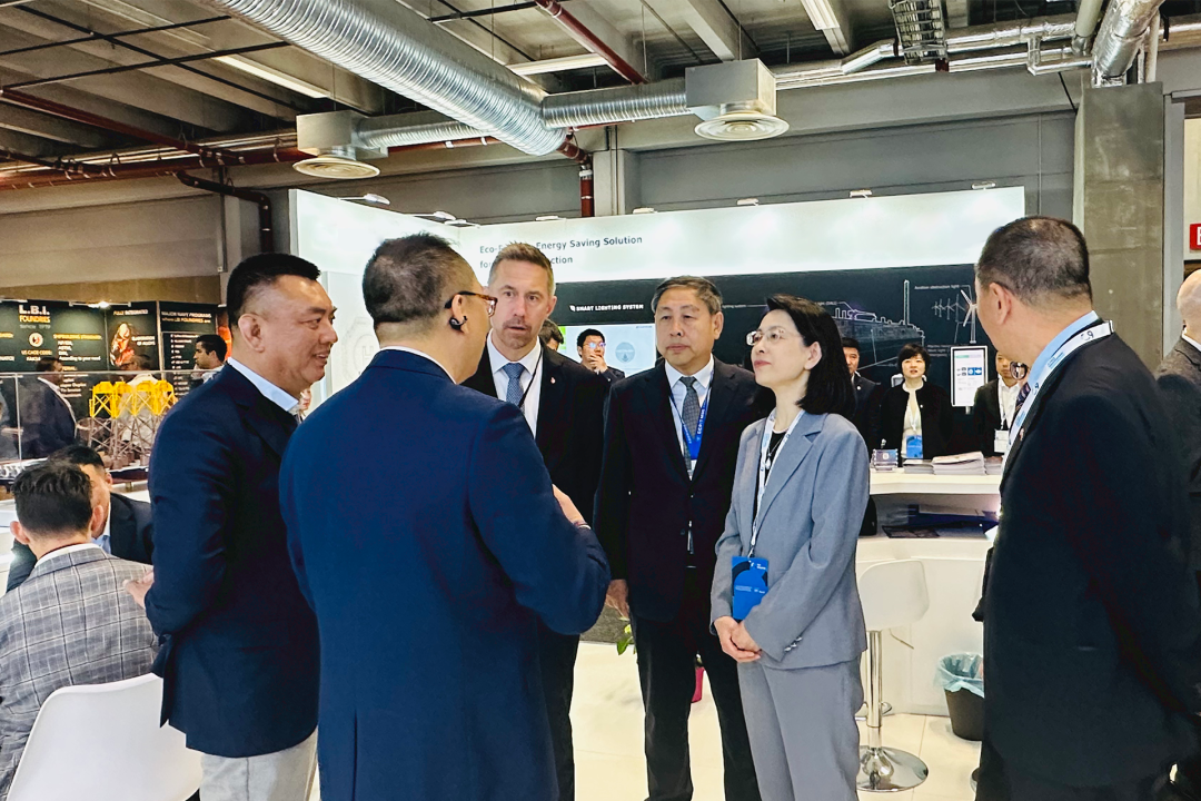 研讨会后,中国驻挪威大使侯悦、挪威贸易、工业和渔业部国务秘书埃文·萨格巴肯特别到访大金重工展位现场(D06-27),大金重工董事长金鑫带队接待,双方围绕加强行业交流、支持企业发展、推动绿色转型等内容展开深入探讨,旨在促进大金重工与挪威企业深入合作,助力大金重工在绿色能源领域实现更大突破。