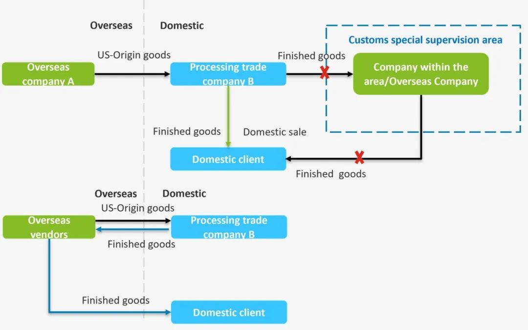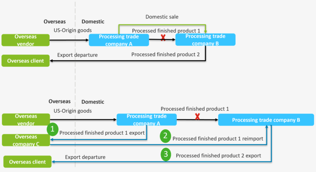 Starting from 12:01 p.m. on 10 April 2025, bonded processed products containing US-origin materials are no longer permitted to circulate under bonded status, whether within or outside customs special supervision areas. This restriction applies to the "factory transfer" or "U turn" model (illustrated below). This change may significantly impact companies' bonded operation management.