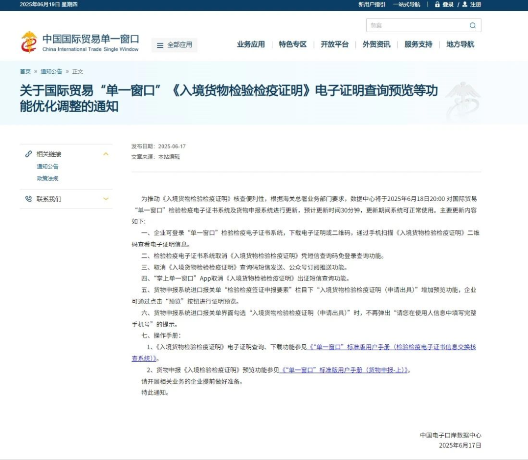为进一步推进智慧海关建设,优化调整后的国际贸易“单一窗口”《入境货物检验检疫证明》电子证明下发及验证功能已于6月19日上线。