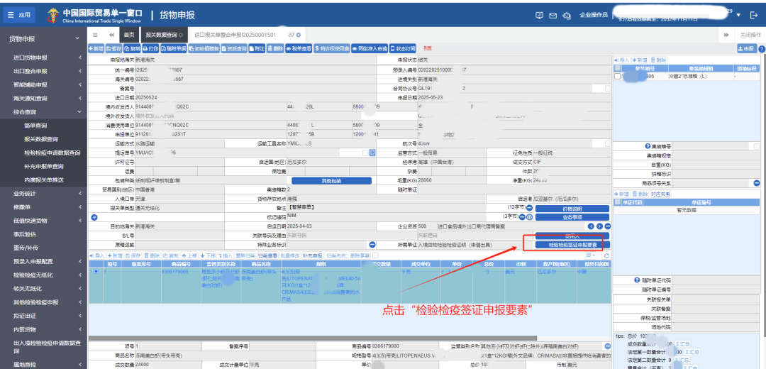 勾选“入境货物检验检疫(申请出具)”项目