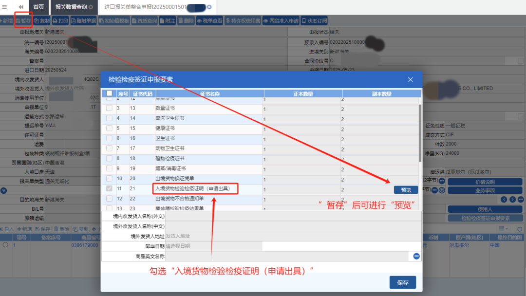 注意:预览前,请先暂存报关单数据。