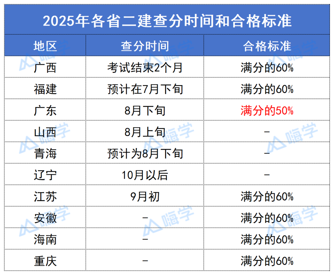 大部分地区会在公布二建成绩的同时公布二建合格标准,所以大家不用着急,可以参考历年的二建合格标准估分。