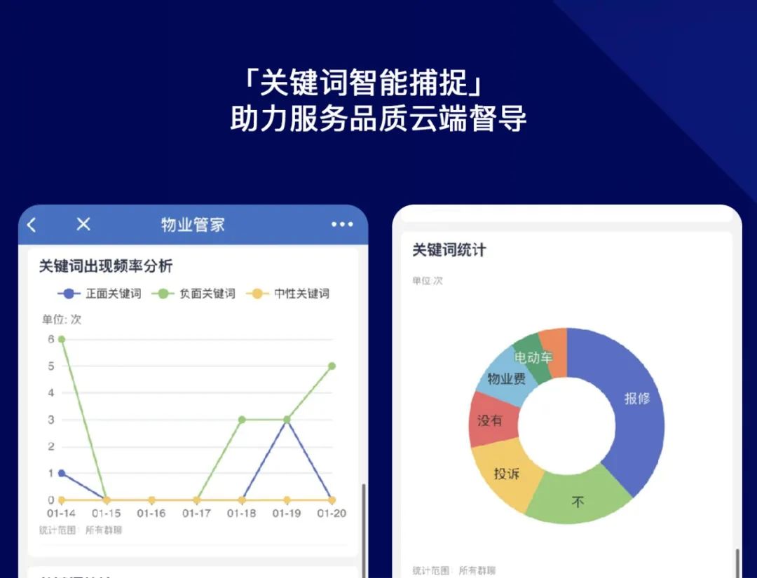 在群聊和一对一的聊天中,系统会自动捕捉相关关键词,提醒服务者关注业主需求重点,也监督服务者否保持着礼貌与专业性。