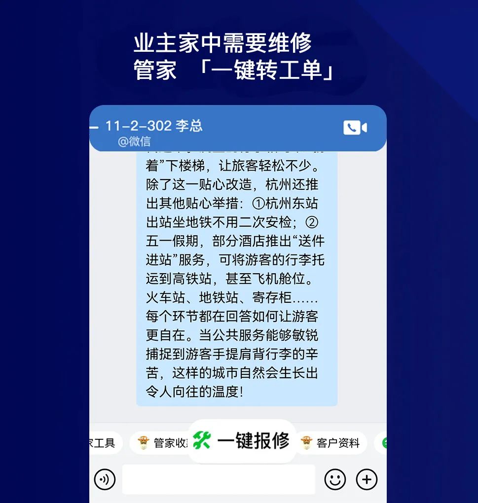 一个人的精力始终是有限的,对于管家来说,有时候业主群里信息多了,管家这边要回信息,那边要下工单,一时难以兼顾便影响业主的居住体验。