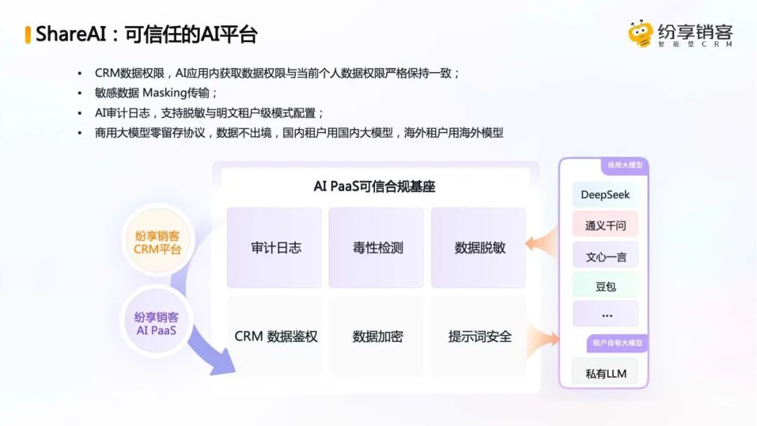 纷享销客在企业级 AI 领域聚焦可信任能力构建,除上层业务应用外,底层平台持续强化合规基座,在数据与模型交互中具备隐私数据处理及掩码能力,对大模型输出数据进行毒性检测与不良信息过滤,完善数据加密与安全机制;与大模型合作需签订安全协议确保数据不被用于训练,还提供 DeepSeek 本地部署空间;同时对所有 AI 调用过程进行审计,既实现可追溯性又能基于审计结果优化系统。