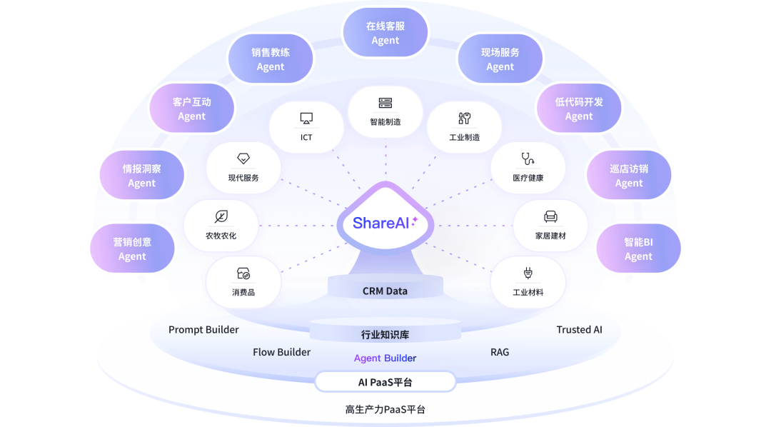 ShareAgent 是纷享销客基于 PaaS 基础能力打造的 AI Agent 开发平台,借助 ShareAgent 的 AI 可视化设计与编排工具可以通过零代码或低代码的方式,快速搭建出基于大模型的各类 Agent ,满足业务的 AI 个性化需求。