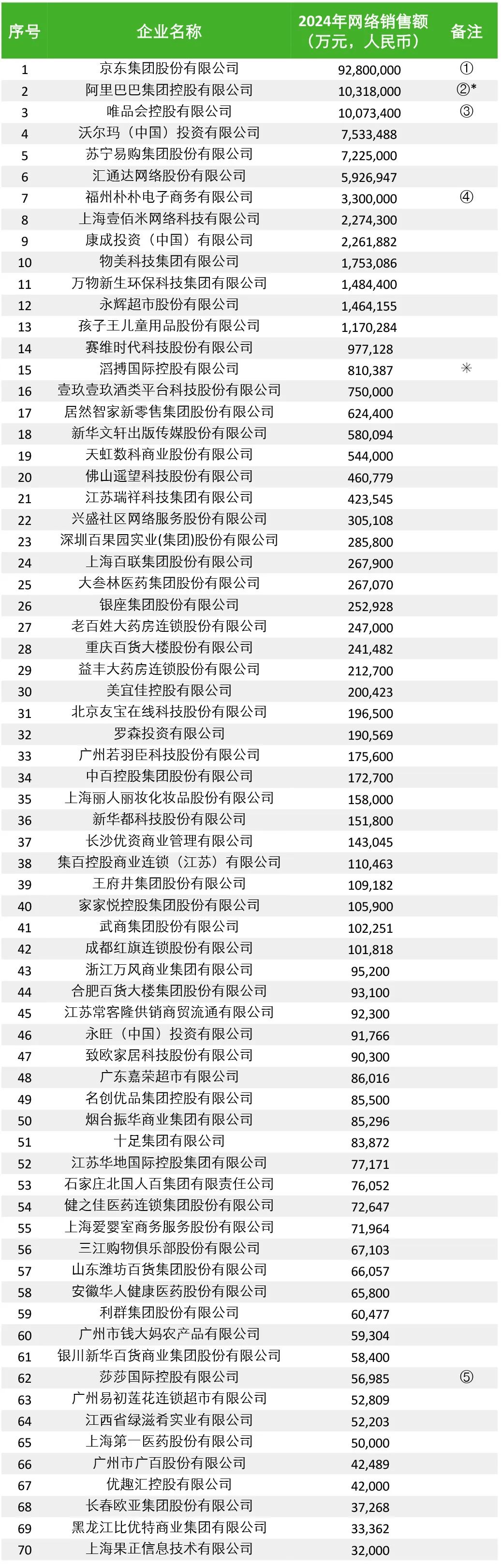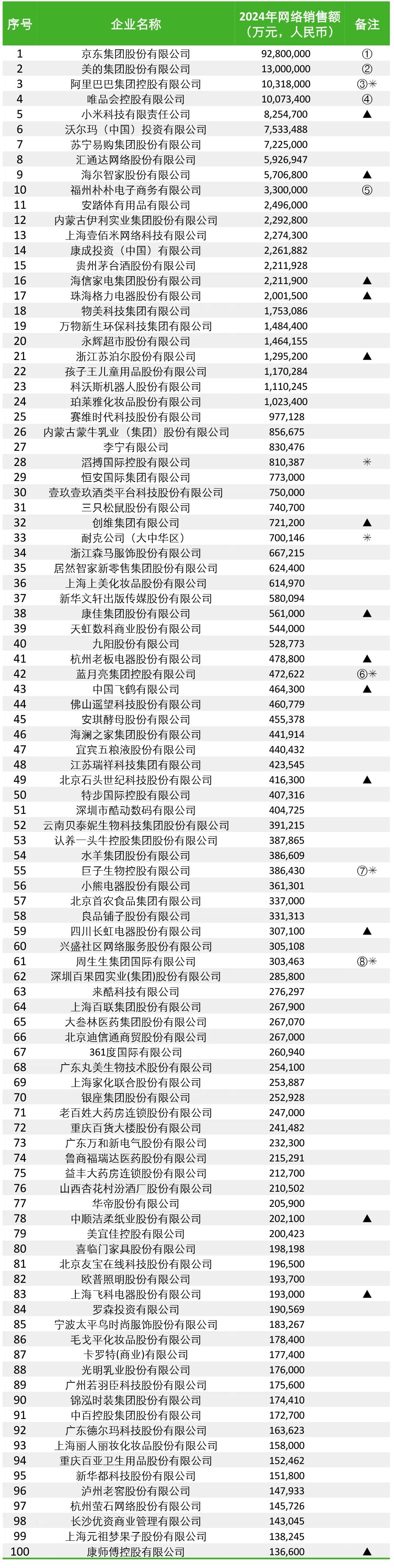 1.榜单中零售企业的网络零售额,仅计算线上渠道自营商品的销售额(含企业在第三方平添上自营旗舰店的销售额)。