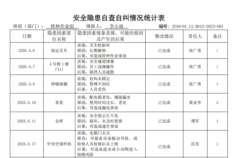 活动期间,长虹飞狮对宿舍、食堂、生产车间等区域开展“拉网式”排查,累计发现叉车轮胎磨损、安全通道堵塞等隐患86项,均明确责任人并限期整改。如针对食堂配电箱老化问题,维修班24小时内完成更换;仓库安全指示灯损坏问题,当日即落实维修。《安全隐患自查自纠情况统计表》显示,所有隐患整改完成率达100%,形成“排查-整改-验收”闭环管理。