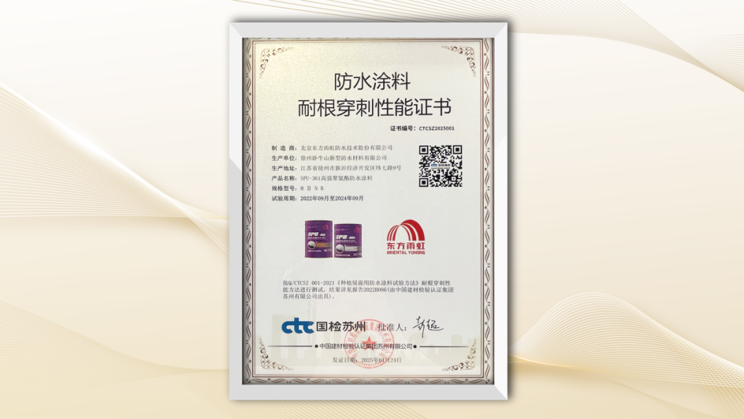 值得关注的是,东方雨虹SPU-361高强聚氨酯防水涂料以突出的性能优势率先通过中国建材检验认证集团苏州有限公司专业检测,获颁防水涂料耐根穿刺性能证书(证书编号:CTCSZ2025001),成为国内首批通过该项检测的防水材料。