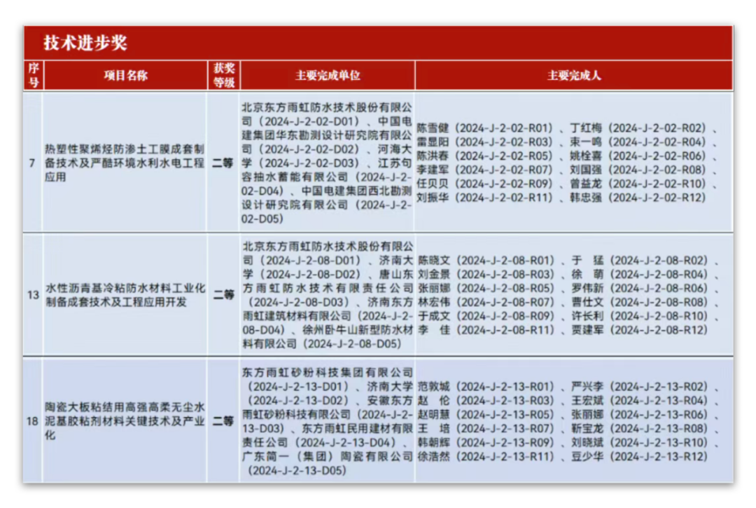 近年来,在强核心、提质效、重创新、促发展的合力助推下,企业系列创新成果实现密集突破,种植顶板用高分子防排蓄水集成系统、TKB-500太空堡SBS改性沥青防水卷材、DMSC硅烷改性聚醚防水涂料、VPC-100透汽型柔性防水涂料、高密度聚乙烯(HDPE)自粘胶膜防水卷材等高性能产品及系统解决方案,接连获得行业权威认证及重大奖项,有力印证企业在建筑建材领域的技术创新优势。就在前不久中国建筑材料联合会发布的《关于2024年度建筑材料科学技术奖获奖项目的公告》中,由东方雨虹作为主要完成单位的三项科研成果——《热塑性聚烯烃防渗土工膜成套制备技术及严酷环境水利水电工程应用》《水性沥青基冷粘防水材料工业化制备成套技术及工程应用开发》《陶瓷大板粘结用高强高柔无尘水泥基胶粘剂材料关键技术及产业化》荣获技术进步奖二等奖,进一步彰显出行业对东方雨虹创新实力的高度认可。