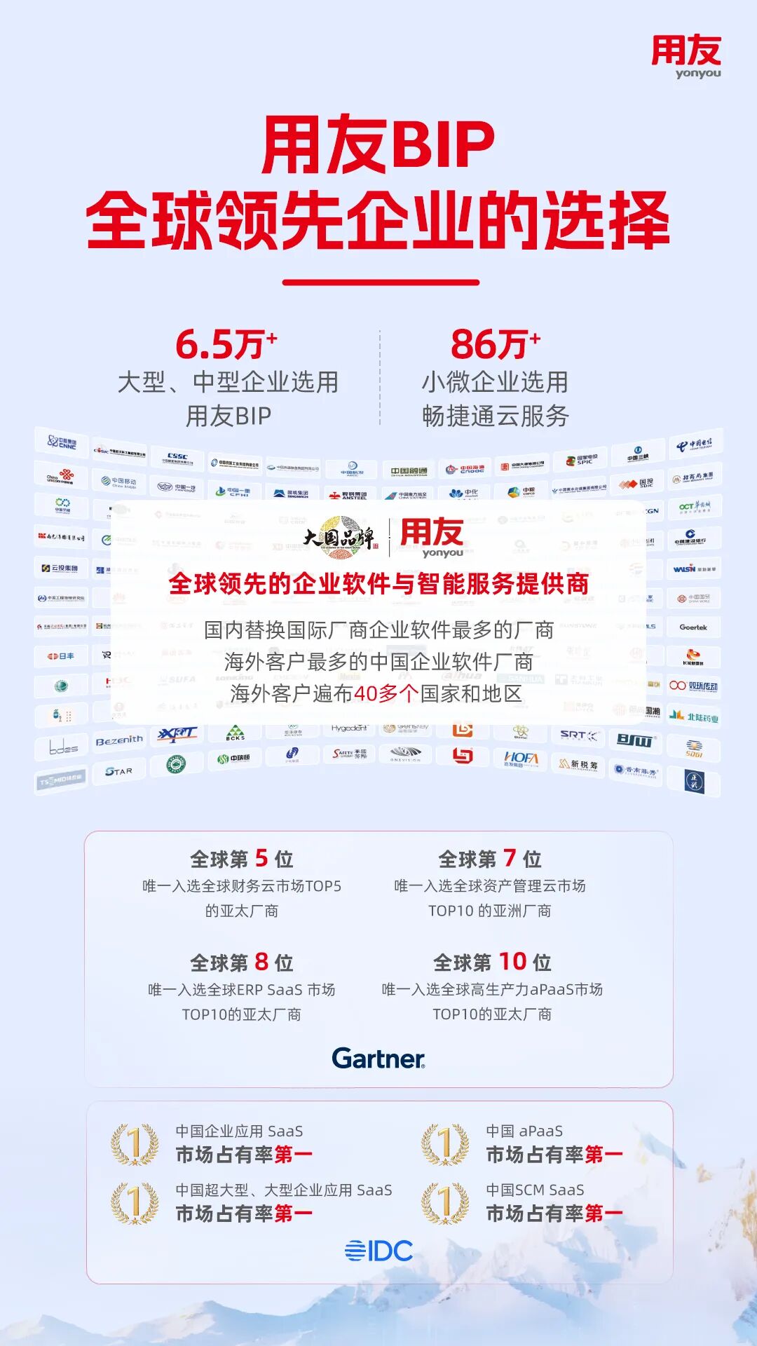 用友自1988年创立以来,始终致力于服务企业管理变革和商业创新。在数智化时代,用友战略投入、规模研发打造了新一代企业软件——用友BIP,服务企业数智化转型,助力企业拥抱AI。截至目前,已有6.5万家大中型企业选择用友BIP推进数智化转型升级,实现“业务敏捷、精益管理、全球运营”。此外,还有86万家小微企业使用用友子公司畅捷通的云服务产品,用户遍布各个行业和海内外。