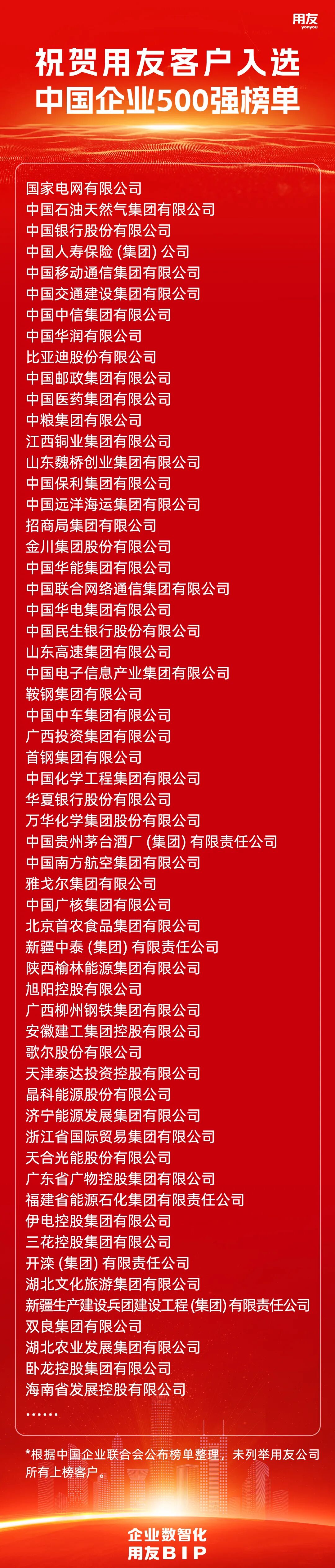近日,中国企业联合会、中国企业家协会发布了“2025中国企业500强”榜单。其中,众多用友的客户企业入选榜单。这些企业不仅以营收规模名列前茅,在时代浪潮下,更是携手用友加速数智化转型,以成功的实践向业界提供了高价值的转型路径参考(文末扫码,获取同款解决方案)。