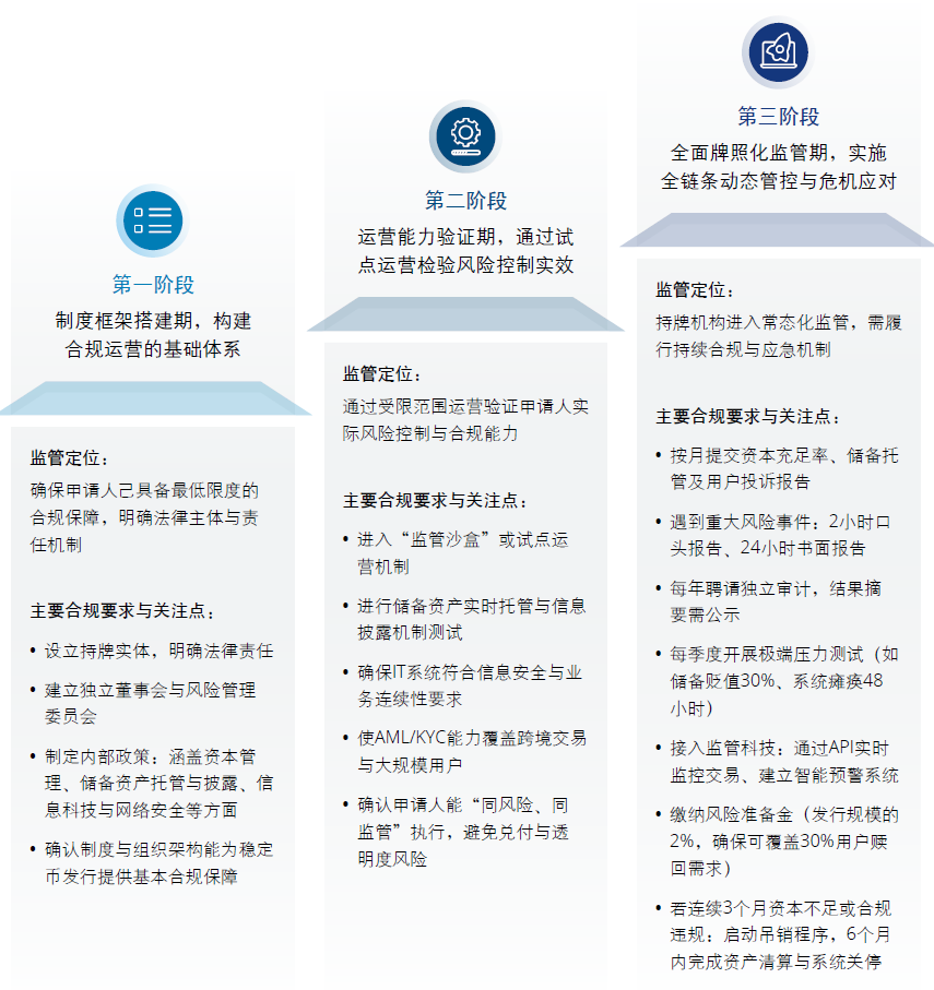 在监管要求之外,香港金融管理局对稳定币牌照的申请与落地还提出了循序渐进的实施路径。