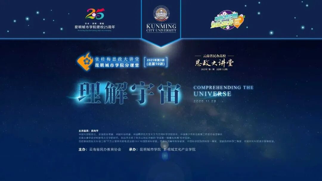 11月28日,在新视域文化产业学院的支持下,张桂梅思政大讲堂昆明城市学院分课堂(第十讲)、云南省民办高校思政大讲堂(第十五期)开讲。中国科学院院士,全国政协常委,中国科协常委,中国科学院大学天文与空间科学学院院长,中国青少年科技教育工作者协会理事长武向平带来《理解宇宙》主题讲座。