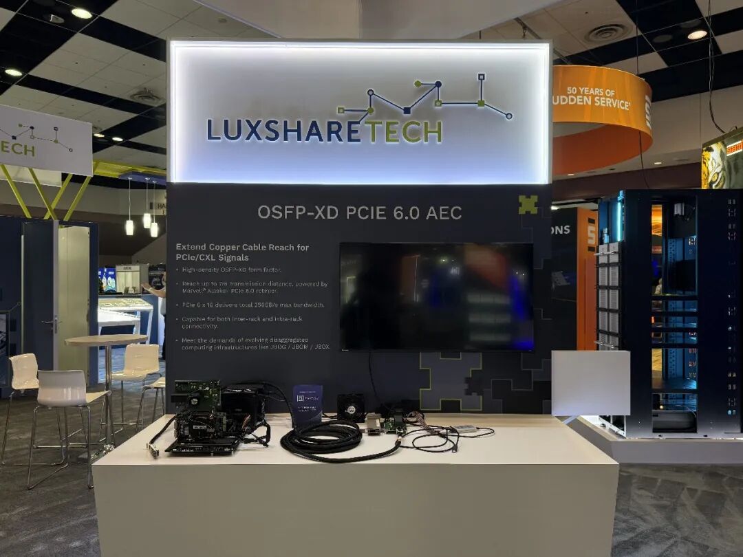 本次展会全新展出的OSFP‑XD PCIe 6.0 AEC产品具有显著技术优势。该产品采用高密度OSFP‑XD封装,专门用于延长PCIe与CXL信号的铜缆传输距离,搭载Marvell® Alaska®P PCIe 6.0重定时器后,传输距离可达7米,支持PCIe 6 x16规格,总最大带宽高达256GB/s,可完美适配JBOG、JBOM、JBOX等演进式解耦计算架构,灵活满足机架间、机架内的连接需求,为数据中心架构升级提供有力支撑。