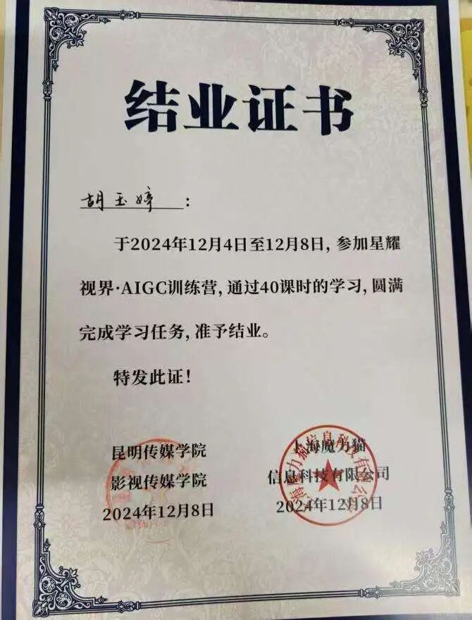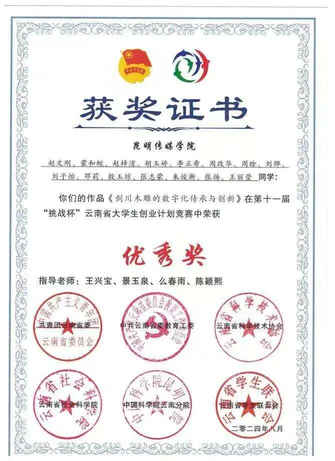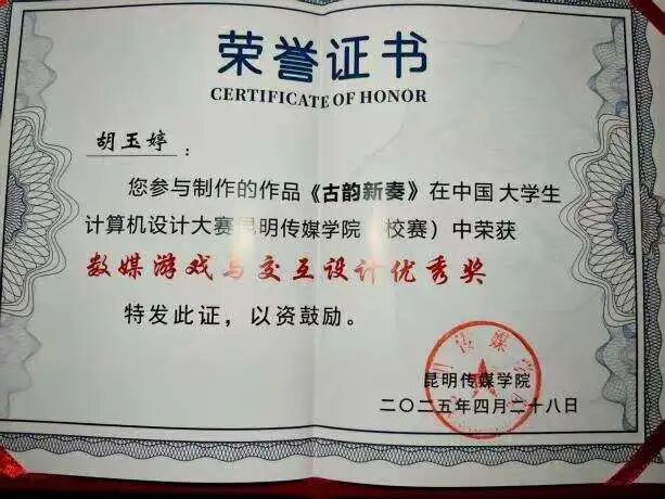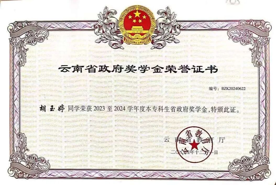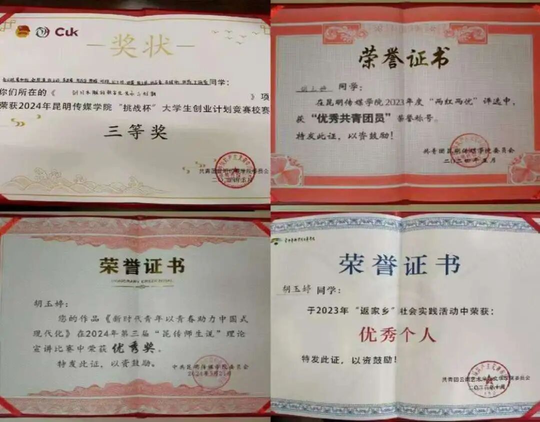 勤勉与坚持换来丰硕成果。大学期间,她的成绩始终名列前茅,连续两年位列专业第一。同时,她积极投身各类学科竞赛与创新创业活动,在老师指导下屡获佳绩,包括:第十九届中国好创意暨全国数字艺术设计大赛-青瞳视觉“数字造梦”专项大赛-数字人表演秀-国赛三等奖、中国大学生计算机设计大赛校赛三等奖、云南省第十一届 “挑战杯” 大学生创业计划省级优秀奖、院级三等奖、大学生创新创业计划校级优秀奖;作品《隐藏的罪恶》在第36个国际禁毒日禁毒微视频作品征集活动中荣获省级三等奖......她用实力书写了“励志笃行”的青春答卷。
