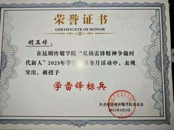 “知不足而奋进,望远山而前行。”凭借出色的领导与组织协调能力,胡玉婷在学生会任职期间,圆满组织毕业影展、迎新晚会等各类活动数十次,为学院营造了积极向上的校园氛围。作为班长,她协助老师完成“焕彩南云・中国与东南亚数字艺术展学习活动”,认真落实各项任务,团结同学、凝聚班级,使班集体成为温暖而富有战斗力的大家庭。同时带领班级连续两年获评云南省“先进班集体”(2023-2024学年、2024-2025学年);作为团支部副书记,协助团支书带领支部连续两年荣获昆明传媒学院“五四红旗团支部”称号(2024年5月、2025年5月)。